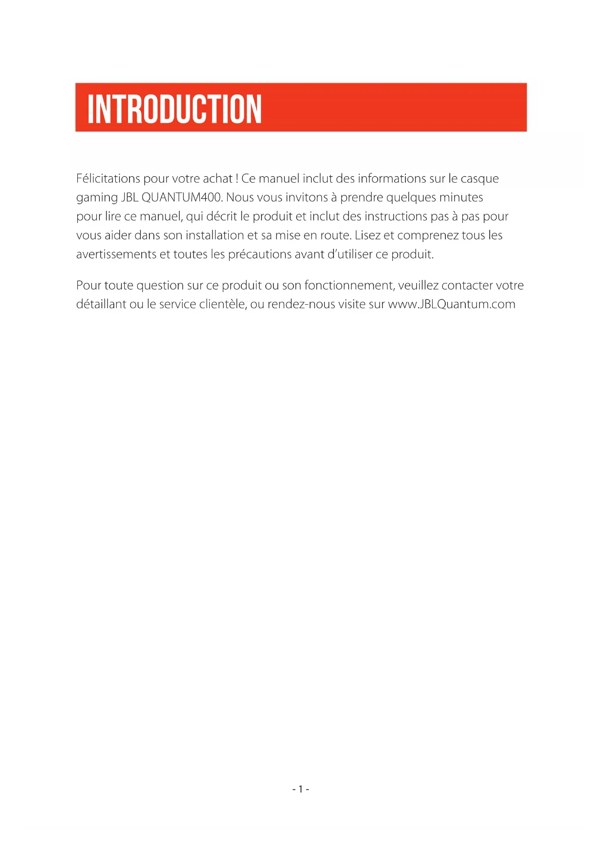 Introduction Félicitations pour votre achat ! Ce manuel inclut des informations sur le casque gaming JBL QUANTUM400. Nous vous invitons à prendre quelques minutes pour lire ce manuel, qui décrit le produit et inclut des instructions pas à pas pour vous aider dans son installation et sa mise en route. Lisez et comprenez tous les avertissements et toutes les précautions avant d’utiliser ce produit. Pour toute question sur ce produit ou son fonctionnement, veuillez contacter votre détaillant ou le service clientèle, ou rendez-nous visite sur www.JBLQuantum.com- 2 - Contenu de la boîte
