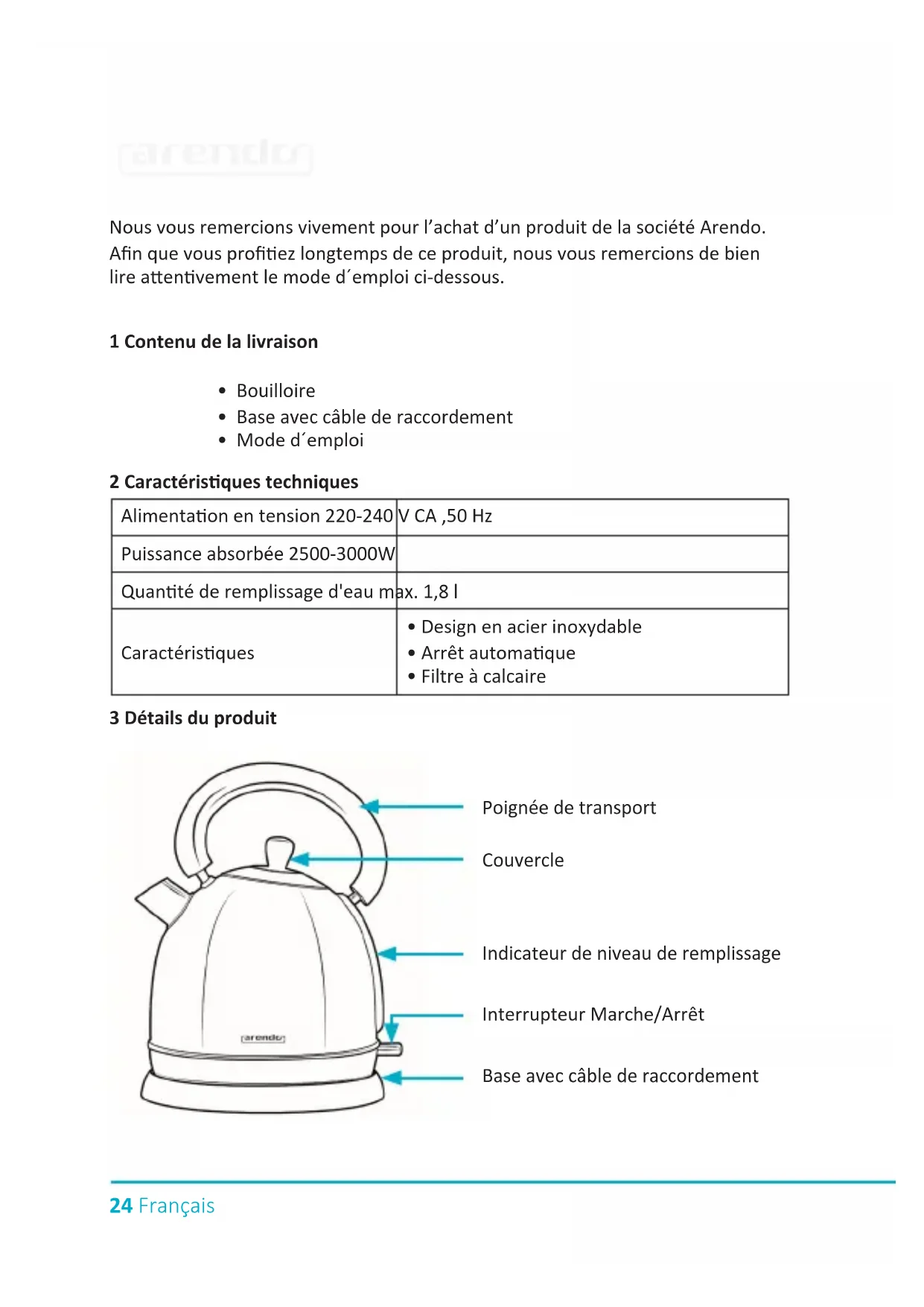 WBA380 300718 - Bouilloire Arendo - Notice d'utilisation et mode d'emploi gratuit