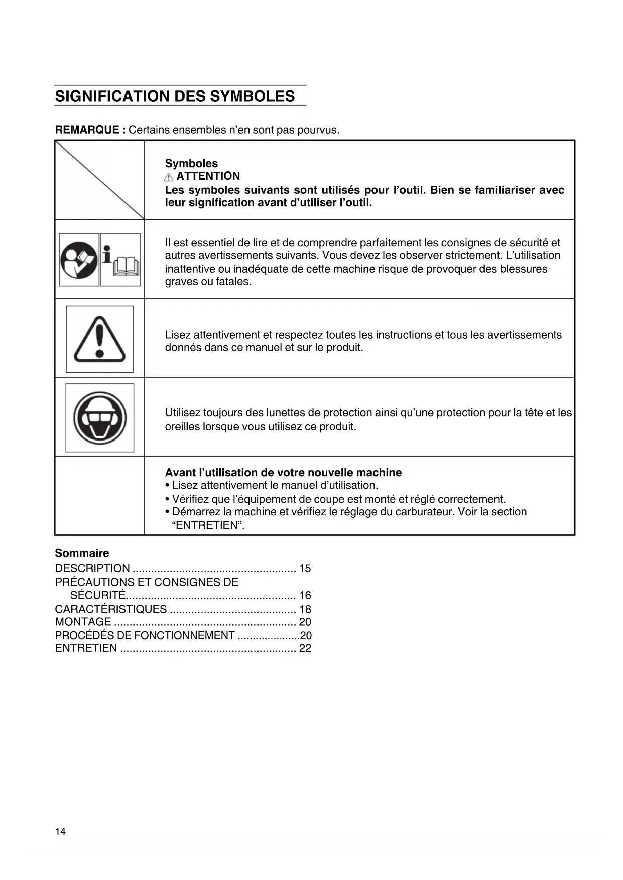 - Démarrez la machine et vérifi ez le réglage du carburateur. Voir la section “ENTRETIEN”. Sommaire DESCRIPTION ..................................................... 15