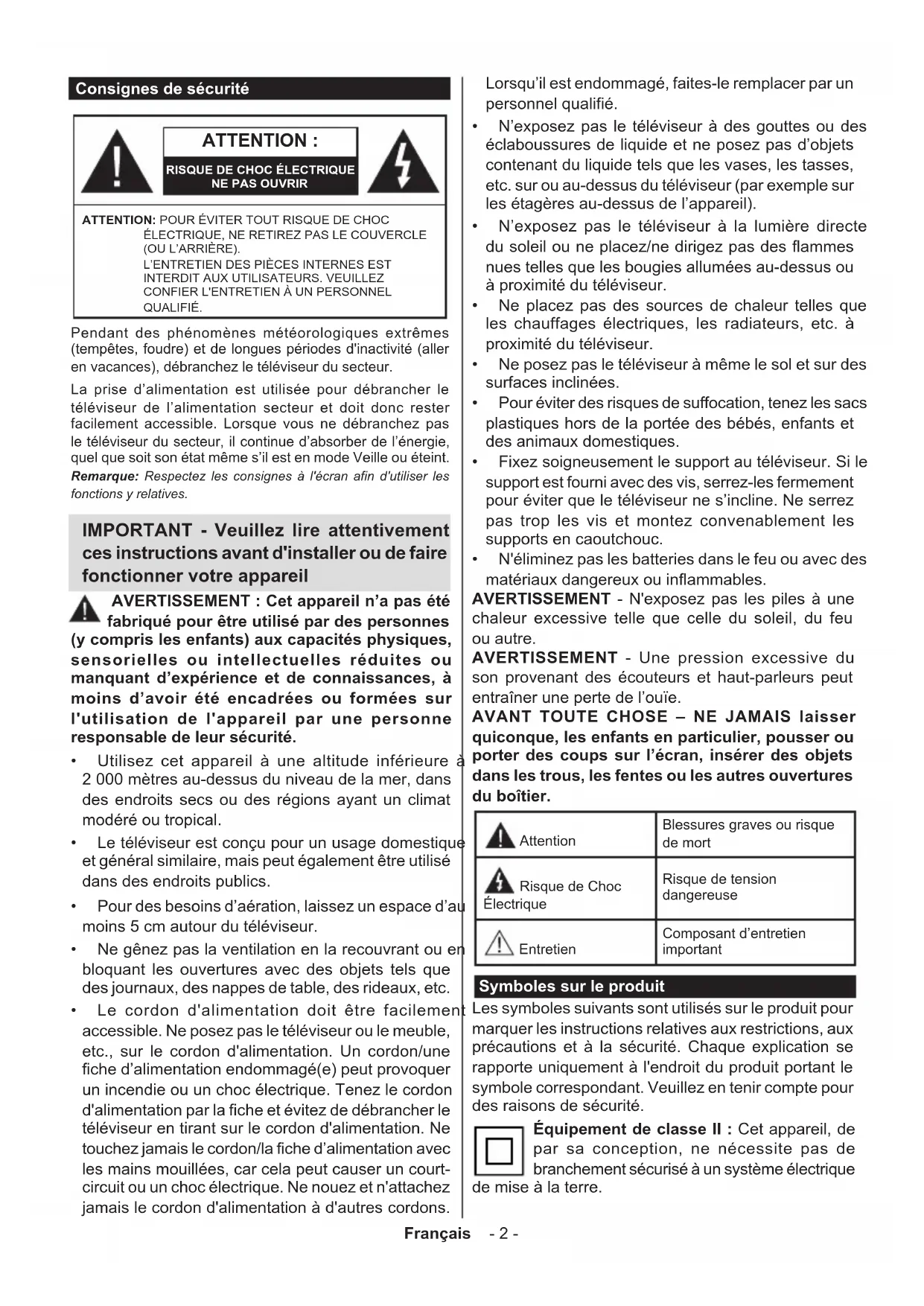 - N'éliminez pas les batteries dans le feu ou avec des matériaux dangereux ou inflammables. AVERTISSEMENT - N'exposez pas les piles à une chaleur excessive telle que celle du soleil, du feu ou autre. AVERTISSEMENT - Une pression excessive du son provenant des écouteurs et haut-parleurs peut entraîner une perte de l’ouïe. AVANT TOUTE CHOSE – NE JAMAIS laisser quiconque, les enfants en particulier, pousser ou porter des coups sur l’écran, insérer des objets dans les trous, les fentes ou les autres ouvertures du boîtier. Attention Blessures graves ou risque de mort Risque de Choc Électrique Risque de tension dangereuse Entretien Composant d’entretien important Symboles sur le produit Les symboles suivants sont utilisés sur le produit pour marquer les instructions relatives aux restrictions, aux précautions et à la sécurité. Chaque explication se rapporte uniquement à l'endroit du produit portant le symbole correspondant. Veuillez en tenir compte pour des raisons de sécurité. Équipement de classe II : Cet appareil, de par sa conception, ne nécessite pas de branchement sécurisé à un système électrique de mise à la terre.Français - 3 - Borne dangereuse sous tension : Les bornes marquées, dans des conditions normales d'utilisation, sont dangereuses lorsqu'elles sont sous tension.