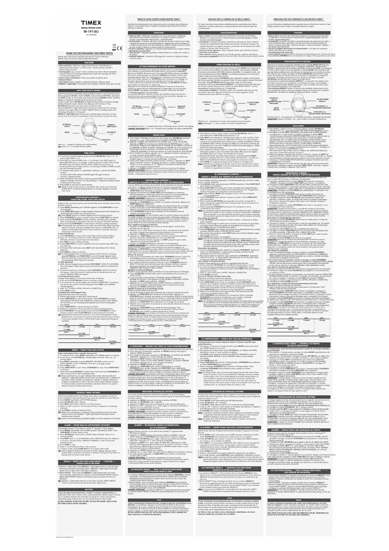 COMPTER ET STOCKER LES TEMPS AU TOUR/INTERMÉDIAIRES L’écran affiche les minutes, les secondes et les centièmes de seconde pendant une heure ; il affiche ensuite les heures, les minutes et les secondes. A. Appuyer sur MODE plusieurs fois jusqu’à afficher CHRONO. Appuyer sur START/SPLIT pour démarrer le chronomètre. B. Appuyer de nouveau sur START/SPLIT pour enregistrer un temps au tour/intermédiaire. L’affichage indique les temps au tour/intermédiaires pendant 10 secondes, puis retourne au chronomètre en marche. CONSEIL PRATIQUE : Appuyer sur le bouton MODE pour interrompre l’affichage et voir le chronomètre en marche. C. Appuyer sur STOP/RESET pour arrêter ou marquer une pause. Appuyer sur START/SPLIT pour redémarrer. D. Tenir SET/RECALL enfoncé pour stocker une séance d’exercice, y compris la date, les temps au tour/intermédiaires et la durée totale. Sauter cette étape si vous ne souhaitez pas stocker la séance d’exercice. E. Tenir STOP/RESET enfoncé pour remettre le chronomètre à zéro et minuter une autre séance. CONSEIL PRATIQUE : Le chronomètre reste en marche lorsque vous quittez un mode. Lorsque une séance d’exercice est stockée, l’affichage indique la quantité de mémoire disponible ou MEMORY FULL (la mémoire est pleine). S’il ne reste pas suffisamment de mémoire pour la séance entière, seuls la durée totale et les tours précédents seront stockés. Pour rappeler les séances d’exercice : A. Appuyer sur SET/RECALL pour passer en mode rappel. La date de la dernière séance clignote. B. Appuyer sur +/– pour choisir la séance à revoir. Les séances sont stockées par dates. Plusieurs séances peuvent être stockées à la même date. C. Appuyer sur NEXT pour afficher les détails de la séance. D. Appuyer sur START/SPLIT pour revoir les temps au tour/intermédiaires de tours successifs, le MEILLEUR tour et le tour MOYEN. E. Pour revoir d’autres séances, appuyer sur NEXT jusqu’à ce que la date clignote, puis suivre les étapes B à D. F. Appuyer sur DONE (Validé) pour retourner au chronomètre. CONSEIL PRATIQUE : Pour afficher les temps au tour/intermédiaires de la séance courante alors que le chronomètre est en marche, appuyer sur SET/RECALL et START/SPLIT pour faire défiler les temps au tour/intermédiaires, le MEILLEUR tour et le tour MOYEN. Le tour courant ne sera pas affiché. Aucune autre séance ne peut être affichée lorsque le chronomètre est en marche. Effacer les séances A. Alors que le chronomètre est arrêté, tenir STOP/RESET enfoncé. HOLD TO CLR WORKOUT (tenir enfoncé pour effacer) s’affiche. Lorsque l’alerte sonne, la dernière séance stockée est effacée de la mémoire. B. Pour effacer toutes les séances, continuer à tenir STOP/RESET enfoncé. HOLD TO CLR ALL (tenir enfoncé pour tout effacer) s’affiche. L’alarme sonne pour indiquer que toutes les séances stockées sont effacées. MEMORY FREE (mémoire libre) s’affiche. Modifier le format d’affichage Modifier ce qui apparaît dans la première et la seconde ligne de l’affichage. A. Tenir SET/RECALL enfoncé (alors que le chronomètre est en marche ou remis à zéro). B. Si aucune séance n’est stockée, l’affichage indique FORMAT/SET (réglage du format). Si des séances ont été stockées, la dernière s’affiche. Appuyer sur NEXT jusqu’à afficher FORMAT. C. Appuyer sur +/– pour sélectionner LAP/SPL, SPL/LAP, ou RUN/TOTAL (au tour/intermédiaire, intermédiaire/au tour ou total de la course). D. Appuyer sur DONE (Validé) pour quitter. Afficher la durée de la course/temps écoulé Établir la durée totale d’un exercice. A. Suivre les étapes ci-dessus pour sélectionner le format Total de la course. B. Appuyer sur START/SPLIT pour démarrer le chronomètre. Appuyer sur STOP/RESET pour marquer une pause. Le chronomètre affiche le temps écoulé jusqu’au moment où le bouton est enfoncé. L’affichage inférieur se poursuit et indique le temps écoulé depuis que le chronomètre a été mis en marche. C. Appuyer sur START/SPLIT pour reprendre le minutage de l’activité. D. Répéter pour enregistrer la durée de la course (durée totale de l’exercice) et le temps écoulé. E. Appuyer sur STOP/RESET pour arrêter le chronométrage. Tenir STOP/RESET enfoncé pour remettre le chronomètre à zéro ou tenir SET/RECALL pour stocker la séance (durée de la course). CONSEIL PRATIQUE : Le compteur du temps écoulé continue à fonctionner jusqu’à ce que le chronomètre soit remis à zéro. Le temps écoulé n’est pas stocké en mémoire. Seule la durée totale de l’exercice est stockée. Si vous enregistrez les temps au tour / intermédiaires en mode TOTAL RUN, l’affichage passe à Lap/Split (temps au tour / intermédiaire). Printed in the Philippines W191_EU_NO FLIX_Rev_0804206-Inst. W-191 Euro 8/10/12 10:24 AM Page 1TIMEX INTERNATIONALE GARANTIEFür Ihre TIMEX -Uhr übernimmt die Timex Group USA, Inc. eine Garantie auf Herstellungsmängel fürdie Dauer EINES JAHRES vom Original-Verkaufsdatum. Timex und ihre Partner weltweit erkennendiese internationale Garantie an. Bitte beachten Sie, dass Timex nach eigenem Ermessen die Uhr durch Installieren neuer oder gründlich überholter und überprüfter Komponenten reparieren bzw. durch ein identisches oder ähnliches Modell ersetzen kann. WICHTIG — BITTE BEACHTEN SIE, DASS SICH DIESE GARANTIENICHT AUF MÄNGEL ODER SCHÄDEN IHRER UHR BEZIEHT:1) wenn die Garantiezeit abgelaufen ist;2) wenn das Produkt ursprünglich nicht von einem autorisierten TIMEX-Händler gekauft wurde;3) wenn Reparaturen nicht von TIMEX durchgeführt wurden;4) wenn diese durch Unfälle, unbefugte Eingriffe oder unsachgemäße Behandlung entstanden sind;