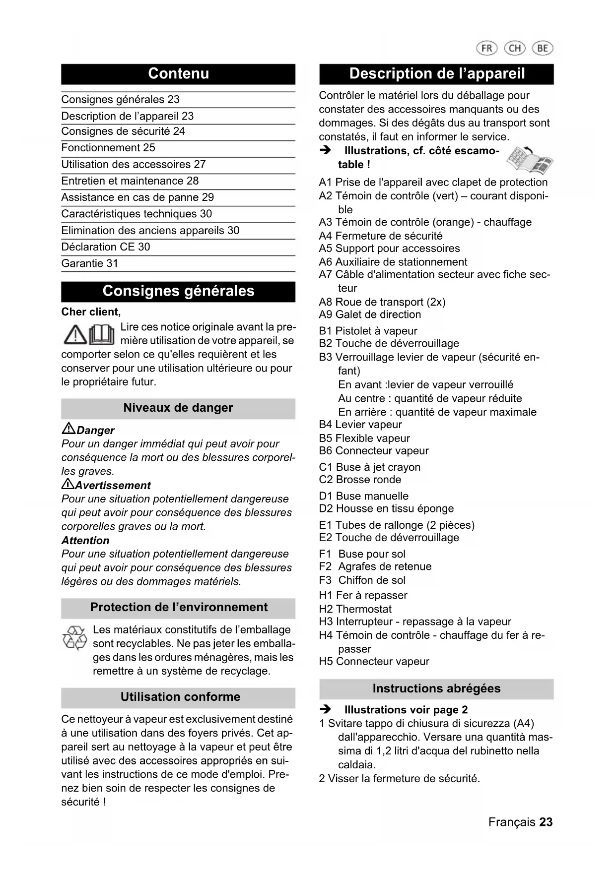 Warranty Warranty card Company and seller's headquarters: Service address: Phone hotline: Email Name of manufacturer/importer: Product name: Product/manufacturer ID no.: Buyer's name: Postal Code/City: Street: Phone/E-mail: Signature: Fault description:Français 23 Cher client, Lire ces notice originale avant la pre- mière utilisation de votre appareil, se comporter selon ce qu'elles requièrent et les conserver pour une utilisation ultérieure ou pour le propriétaire futur. Danger Pour un danger immédiat qui peut avoir pour conséquence la mort ou des blessures corporel- les graves. 몇 Avertissement Pour une situation potentiellement dangereuse qui peut avoir pour conséquence des blessures corporelles graves ou la mort. Attention Pour une situation potentiellement dangereuse qui peut avoir pour conséquence des blessures légères ou des dommages matériels. Les matériaux constitutifs de l’emballage sont recyclables. Ne pas jeter les emballa- ges dans les ordures ménagères, mais les remettre à un système de recyclage. Ce nettoyeur à vapeur est exclusivement destiné à une utilisation dans des foyers privés. Cet ap- pareil sert au nettoyage à la vapeur et peut être utilisé avec des accessoires appropriés en sui- vant les instructions de ce mode d'emploi. Pre- nez bien soin de respecter les consignes de sécurité ! Contrôler le matériel lors du déballage pour constater des accessoires manquants ou des dommages. Si des dégâts dus au transport sont constatés, il faut en informer le service. Î Illustrations, cf. côté escamo- table ! Î Illustrations voir page 2 1 Svitare tappo di chiusura di sicurezza (A4) dall'apparecchio. Versare una quantità mas- sima di 1,2 litri d'acqua del rubinetto nella caldaia. 2 Visser la fermeture de sécurité. Contenu Consignes générales 23 Description de l’appareil 23 Consignes de sécurité 24 Fonctionnement 25 Utilisation des accessoires 27 Entretien et maintenance 28 Assistance en cas de panne 29 Caractéristiques techniques 30 Elimination des anciens appareils 30 Déclaration CE 30 Garantie 31 Consignes générales Niveaux de danger Protection de l’environnement Utilisation conforme Description de l’appareil A1 Prise de l'appareil avec clapet de protection A2 Témoin de contrôle (vert) – courant disponi- ble A3 Témoin de contrôle (orange) - chauffage A4 Fermeture de sécurité A5 Support pour accessoires A6 Auxiliaire de stationnement A7 Câble d'alimentation secteur avec fiche sec- teur A8 Roue de transport (2x) A9 Galet de direction B1 Pistolet à vapeur B2 Touche de déverrouillage B3 Verrouillage levier de vapeur (sécurité en- fant) En avant :levier de vapeur verrouillé Au centre : quantité de vapeur réduite En arrière : quantité de vapeur maximale B4 Levier vapeur B5 Flexible vapeur B6 Connecteur vapeur C1 Buse à jet crayon C2 Brosse ronde D1 Buse manuelle D2 Housse en tissu éponge E1 Tubes de rallonge (2 pièces) E2 Touche de déverrouillage F1 Buse pour sol F2 Agrafes de retenue F3 Chiffon de sol H1 Fer à repasser H2 Thermostat H3 Interrupteur - repassage à la vapeur H4 Témoin de contrôle - chauffage du fer à re- passer H5 Connecteur vapeur Instructions abrégées24 Français 3 Enfoncez à fond le connecteur vapeur (B6) dans la prise de l'appareil (A1). 4 Brancher la fiche secteur (A7) dans une pri- se de courant. Les deux lampes témoin (A2/A3) doivent être allumées. 5 Attendre environ 8 minutes que le témoin de contrôle orange (A3) s'éteigne. 6 Raccorder l’accessoire nécessaire au pisto- let à vapeur (B1). Le nettoyeur à vapeur est opérationnel. Danger Il est interdit d’utiliser l’appareil dans des do- maines présentant des risques d’explosion. Si l’appareil est utilisé dans des zones dan- gereuses, tenir compte des consignes de sé- curité correspondantes. Ne pas utiliser l'appareil dans des piscines qui contiennent de l'eau. L'appareil ne doit pas être utilisé pour le net- toyage d'appareils électriques, par ex. fours, hottes d'aspiration, fours à microondes, télé- viseurs, lampes, sèches-cheveux, chauffa- ges électriques, etc. Avant l’utilisation, vérifier que l'appareil et les accessoires sont en parfait état. Ne pas utili- ser l'appareil si son état n'est pas irréprocha- ble. Contrôler en particulier les câbles d'alimentation secteur (A7), le verrouillage de sécurité (A4) et le flexible de vapeur (B5). Un câble d’alimentation endommagé doit im- médiatement être remplacé par le service après-vente ou un électricien agréé. Un flexible de vapeur endommagé doit im- médiatement être remplacé. Utiliser unique- ment le flexible vapeur recommandé par le fabricant. Ne jamais saisir la fiche secteur ni la prise de courant avec des mains humides. Ne jamais pulvériser de vapeur sur des ob- jets contenant des substances toxiques (par exemple de l’amiante). Ne jamais approcher la main du jet de va- peur, ou diriger celui-ci sur des personnes ou des animaux (risque de brûlure). 몇 Avertissement L’appareil doit uniquement être raccordé à un branchement électrique mis en service par un électricien conformément à la norme IEC 60364. L'appareil doit être raccordé uniquement au courant alternatif. La tension doit être identi- que avec celle indiquée sur la plaque signa- létique de l’appareil. Dans les pièces humides, telles que les sal- les de bain, exploiter l'appareil uniquement s'il est raccordé à une prise munie d'un dis- joncteur de protection FI placé en amont. Des rallonges non adaptées peuvent pré- senter des risques. Utiliser uniquement un câble de rallonge doté d'une protection anti- éclaboussures et d'une section transversale de 3x1 mm² au minimum. Le raccord entre la fiche électrique et le câ- ble de rallonge ne doit jamais se trouver dans l’eau. En cas de remplacement des raccords du câble d'alimentation ou de la rallonge, s'as- surer que la protection anti-éclaboussures et la résistance mécanique ne 