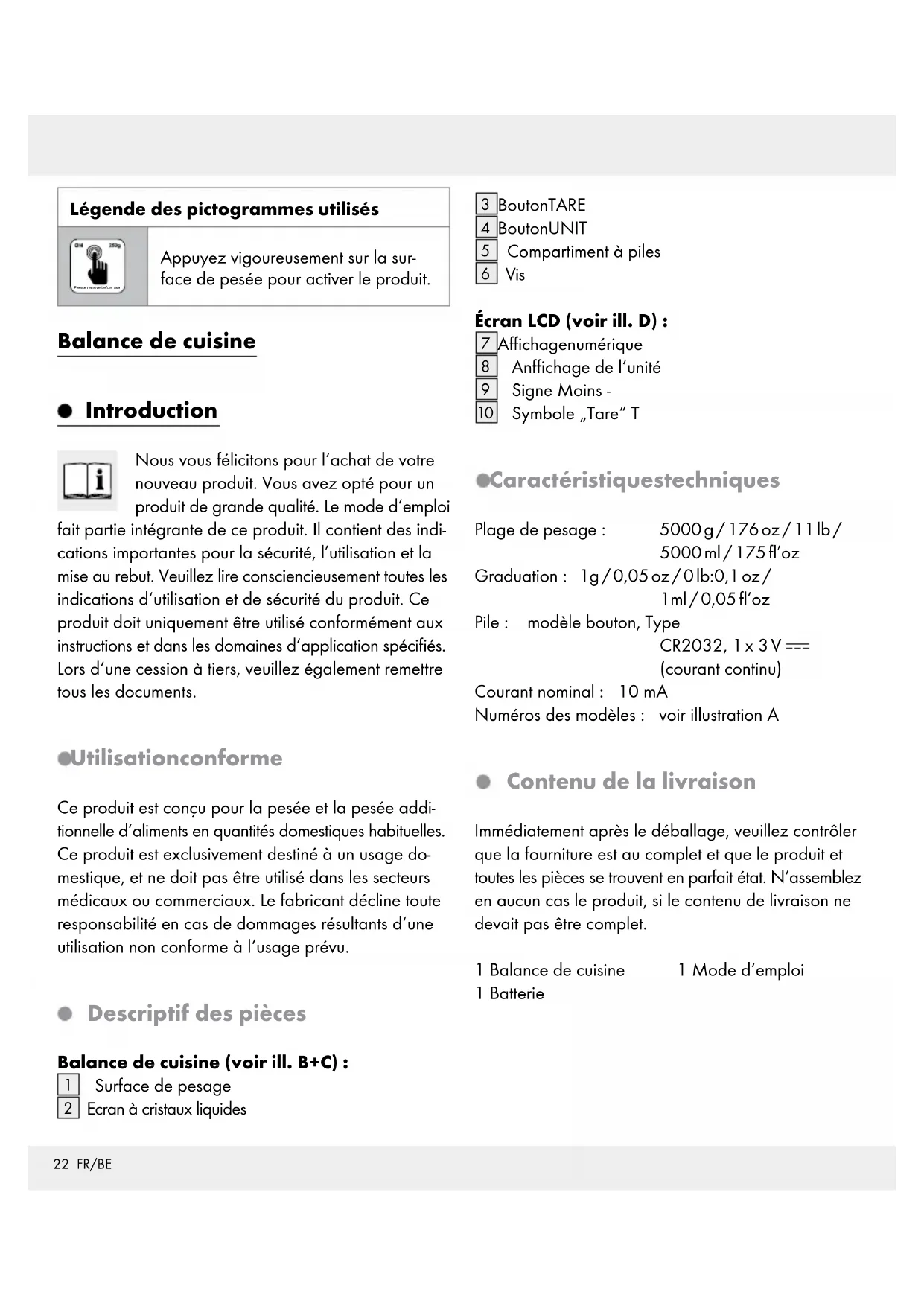 Symbole „Tare“ T Caractéristiques techniques Plage de pesage: 5000 g / 176 oz / 11 lb / 5000 ml / 175 fl’oz Graduation : 1g / 0,05 oz / 0 lb:0,1 oz / 1ml / 0,05 fl’oz Pile : modèle bouton, Type CR2032, 1 x 3 V (courant continu) Courant nominal : 10 mA Numéros des modèles : voir illustration A Contenu de la livraison Immédiatement après le déballage, veuillez contrôler que la fourniture est au complet et que le produit et toutes les pièces se trouvent en parfait état. N‘assemblez en aucun cas le produit, si le contenu de livraison ne devait pas être complet. 1 Balance de cuisine 1 Batterie 1 Mode d‘emploi23 FR/BE Consignes de sécurité