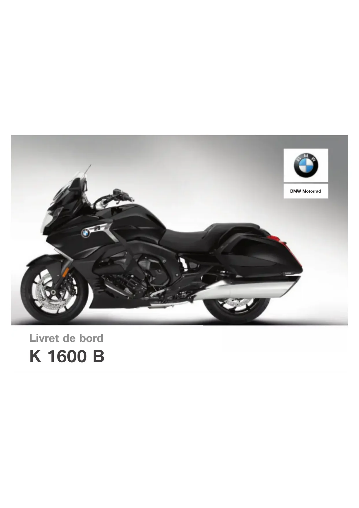 Livret de bord K 1600 B BMW MotorradDonnées moto / concessionnaire Données de la moto Modèle Numéro d'identification du véhicule Code couleur Première immatriculation N° d'immatriculation Données du concessionnaire Interlocuteur au service après-vente Madame/Monsieur N° de téléphone Adresse du concessionnaire/Téléphone (cachet de la société)Bienvenue chez BMW Nous vous félicitons d'avoir porté votre choix sur un véhicule de BMW Motorrad et avons le plaisir de vous accueillir dans le cercle des pilotes BMW. Familiarisez- vous avec votre nouveau véhicule afin d'être en mesure de vous déplacer en toute sécurité sur les routes. À propos de cette notice d'utilisation Lisez cette notice d'utilisation avant de démarrer votre nouvelle BMW. Vous y trouverez des in- dications importantes concernant l'utilisation du véhicule qui vous permettront de profiter pleine- ment des avantages techniques de votre BMW. Vous y trouverez également des informations sur l'entretien et la maintenance de façon à assurer la sécurité de fonctionnement, la sécurité routière et une conser- vation optimale de la valeur de votre véhicule. La justification de l'exécution des travaux de maintenance est une condition préalable à toute pres- tation fournie à titre commercial. Si vous étiez amené un jour à vendre votre BMW, pensez à re- mettre la notice d'utilisation. Elle constitue un élément important de votre véhicule. Suggestions et critiques Votre concessionnaire BMW Motorrad se fera un plaisir de vous conseiller et de répondre à toutes les questions que vous pourrez lui poser au sujet de votre moto. Nous espérons que votre BMW vous donnera entière satisfaction et vous souhaitons bonne route BMW Motorrad.