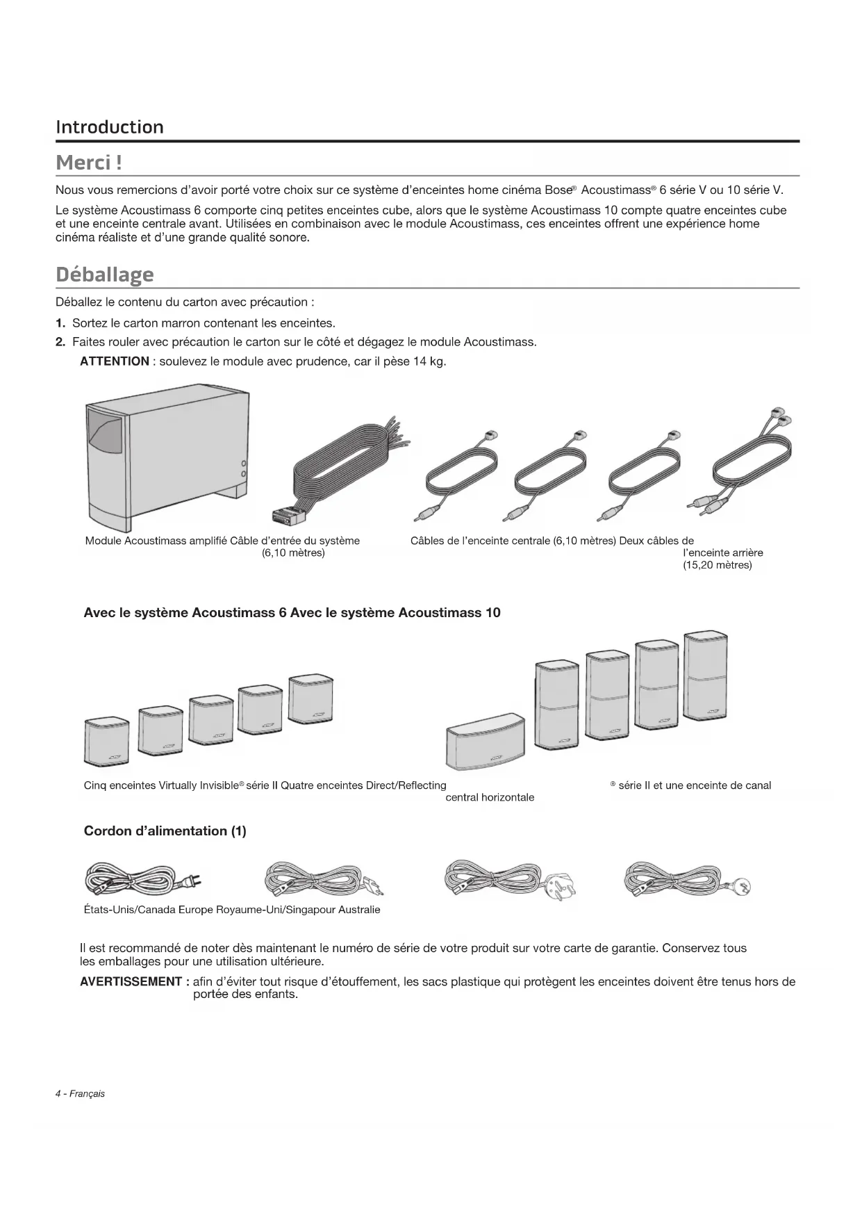 - Le choix de l’emplacement des enceintes doit être déterminé par la forme et les dimensions de votre pièce d’une part, et l’emplacement des meubles d’autre part. Utilisez l’exemple ci-dessous comme guide pour installer votre système home cinéma. Installation Merci! Nous vous remercions d’avoir porté votre choix sur ce système d’enceintes home cinéma Bose Acoustimass 6 série V ou 10 série V. Le système Acoustimass 6 comporte cinq petites enceintes cube, alors que le système Acoustimass 10 compte quatre enceintes cube et une enceinte centrale avant. Utilisées en combinaison avec le module Acoustimass, ces enceintes offrent une expérience home cinéma réaliste et d’une grande qualité sonore. Déballage Déballez le contenu du carton avec précaution :