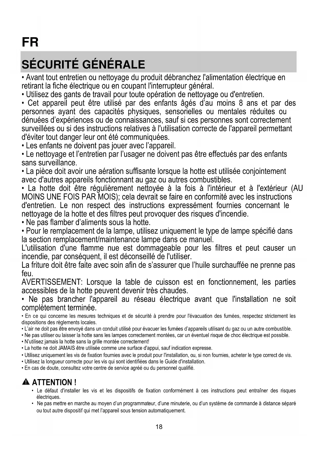 - La hotte ne doit JAMAIS être utilisée comme une surface d'appui, sauf indication expresse.