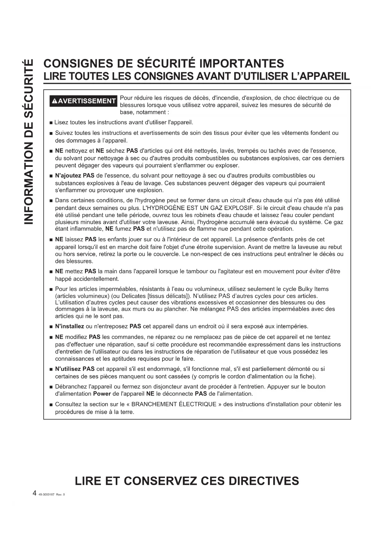 Les voyants de progression des fonctions indiquent ce qui suit (consultez les sections F et G pour plus de détails) : Pause - S’affiche lorsque la laveuse se met en pause entre les cycles. Controls (Les contrôles) - La laveuse est verrouillée - le voyant clignotera une fois si vous appuyez sur un bouton ou si vous tournez le bouton de sélection de programme. Lid Lock (Le couvercle est verrouillé) - Consultez la section Control Lock (verrouillage des commandes). WiFi (certains modèles) - S’affichera lorsque la laveuse est connectée au réseau WiFi. Clignotera lorsque vous tentez de connecter l’appareil au réseau WiFi de votre domicile. Spin Stop (Arrêt de l’essorage) – Signale que le tambour est sur le point de s’immobiliser suite à un essorage. Le couvercle ne se déverrouillera que si le tambour s’est totalement immobilisé. Votre laveuse est équipée d’un Indicateur d’aide au consommateur (IAC). L’IAC est notre façon de communiquer une solution simple dans certaines situations où un appel de service n’est pas nécessaire. Le tableau ci-dessous décrit les messages utiles qui peuvent défiler sur votre affichage lorsque vous retournez pour laver une autre charge. Ces messages présentent des solutions simples que vous pouvez exécuter rapidement.Spin (Une lumière clignotante de spin) Si une condition de déséquilibre est détectée par la laveuse, le voyant d’essorage (Spin) clignotera pendant le restant du cycle et restera allumé pendant une courte période de temps après que le cycle soit terminé. Lorsque cela se produit, la laveuse prend des mesures pour corriger la condition de déséquilibre et de terminer le cycle normalement. Dans certains cas, il est possible que la laveuse ne puisse pas être en mesure d’équilibrer la charge et essorer à plein vitesse. Si vous remarquez que la charge est plus humide que normalement à la fin du cycle, répartissez la charge uniformément dans le panier de lavage et commencez un cycle de Drain & Spin (drainer et essorer). “H2O SUPPLY” (Alimentation d’eau dans la laveuse) Vérifiez l’alimentation d’eau de votre domicile. Avez-vous oublié d’ouvrir un ou les deux robinets d’admission d’eau après l’installation ou au retour de vacances? Aussitôt que le message commence à défiler, la laveuse lance une période de verrouillage de 4 minutes. Les commandes de la laveuse ne répondront pas durant cette période ni ne pourront être changées. Après 4 minutes, vous pouvez redémarrer votre cycle. Si vous tentez d’outrepasser la période de verrouillage en débranchant la laveuse, la minuterie de 4 minutes se mettra en marche de nouveau.“CAnCELEd” (Annulé)“CAnCELED” (Annulé ) peut défiler sur l’affichage si la machine a été mise en pause pendant plus de 24 heures ou si la machine s’est arrêtée par elle-même en raison de certaines erreurs avant que le cycle soit fini. Dès que le message commence à défiler, la laveuse va initier une période de verrouillage « lock-out » pour une durée de 4 minutes. Les commandes de la laveuse ne répondront pas (ni ne pourront être changées) durant cette période. Après les 4 minutes, vous pouvez redémarrer votre cycle . Si vous tentez d’outrepasser la période de verrouillage en débranchant la laveuse, la minuterie de 4 minutes se mettra de nouveau en marche. Si le problème persiste appelez 800.561.3344 pour le service.“Lid” (Couvercle) “Lid” (Couvercle) sera affiché sur l’écran si 3 cycles ont été commencés sans ouvrir le couvercle. La laveuse ne commencera pas un autre cycle jusqu’à ce que le couvercle sera ouvert. Essayez d’ouvrir, puis fermez le couvercle et commencez un nouveau cycle. Si le problème persiste, appelez 800.561.3344 pour le service. Indicateur d’aide au consommateur8 49-3000187 Rev. 0 Programmes de lavage - Bouton de sélection de programme Le programme de lavage commande le type de processus de lavage. Le bouton de sélection de programme peut être tourné vers la droite ou la gauche. La rotation du bouton de sélection de programme après le début d'un programme arrête la laveuse et règle le programme/ les options sur le nouveau programme sélectionné. Appuyez sur Start (départ) pour lancer le nouveau programme sélectionné. Le tableau ci-dessous vous aidera à apparier les articles à laver avec les meilleurs réglages des cycles de lavage. Pour un rendement optimal, sélectionnez le cycle qui s’approche le plus des articles à laver. Les sélections et les options en gras sont les réglages du cycle recommandés. Certains cycles et options ne sont pas offerts sur tous les modèles.