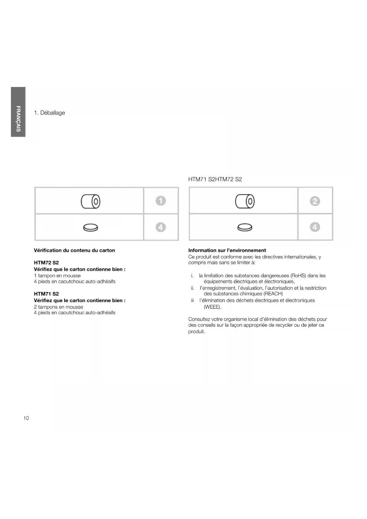 Vérication du contenu du carton HTM72S2 Vériez que le carton contienne bien : 1 tampon en mousse 4 pieds en caoutchouc auto-adhésifs HTM71S2 Vériez que le carton contienne bien : 2 tampons en mousse 4 pieds en caoutchouc auto-adhésifs Information sur l’environnement Ce produit est conforme avec les directives internationales, y compris mais sans se limiter à: