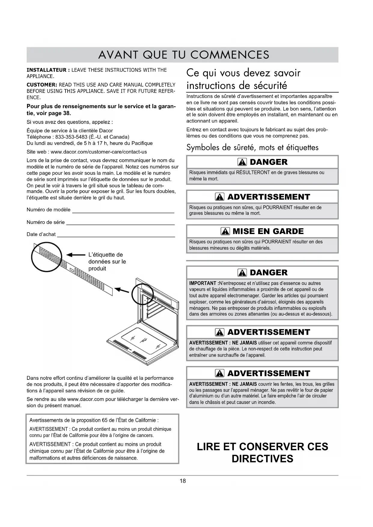 - Garantie et service INSTALLATEUR : LEAVE THESE INSTRUCTIONS WITH THE APPLIANCE.CUSTOMER: READ THIS USE AND CARE MANUAL COMPLETELY BEFORE USING THIS APPLIANCE. SAVE IT FOR FUTURE REFER ENCE. Pour plus de renseignements sur le service et la garan- tie, voir page 38. Si vous avez des questions, appelez :Équipe de service à la clientèle Dacor Téléphone : 833-353-5483 (É.-U. et Canada) Du lundi au vendredi, de 5 h à 17 h, heure du PaciqueSite web : www.dacor.com/customer-care/contact-usLors de la prise de contact, vous devrez communiquer le nom du modèle et le numéro de série de l’appareil. Notez ces numéros sur cette page pour les avoir sous la main. Le modèle et le numéro de série sont imprimés sur l’étiquette de données sur le produit. On peut le voir à travers le gril situé sous le tableau de com-mande. Ouvrir la porte pour exposer le gril. Sur les fours doubles, l’étiquette est située derrière le gril du haut.Numéro de modèle Numéro de série __________________________________Date d’achat _____________________________________Dans notre effort continu d’améliorer la qualité et la performance de nos produits, il peut être nécessaire d’apporter des modica-tions à l’appareil sans révision de ce guide.Se rendre au site www.dacor.com pour télécharger la dernière ver-sion du présent manuel. Ce qui vous devez savoir instructions de sécurité Instructions de sûreté d’avertissement et importantes apparaître en ce livre ne sont pas censés couvrir toutes les conditions possi-bles et situations qui peuvent se produire. Le bon sens, l’attention et le soin doivent être employés en installant, en maintenant ou en actionnant un appareil.Entrez en contact avec toujours le fabricant au sujet des prob-lèmes ou des conditions que vous ne comprenez pas. Symboles de sûreté, mots et étiquettes DANGER Risques immédiats qui RÉSULTERONT en de graves blessures ou même la mort. ADVERTISSEMENT Risques ou pratiques non sûres, qui POURRAIENT résulter en de graves blessures ou même la mort. p. 3818
