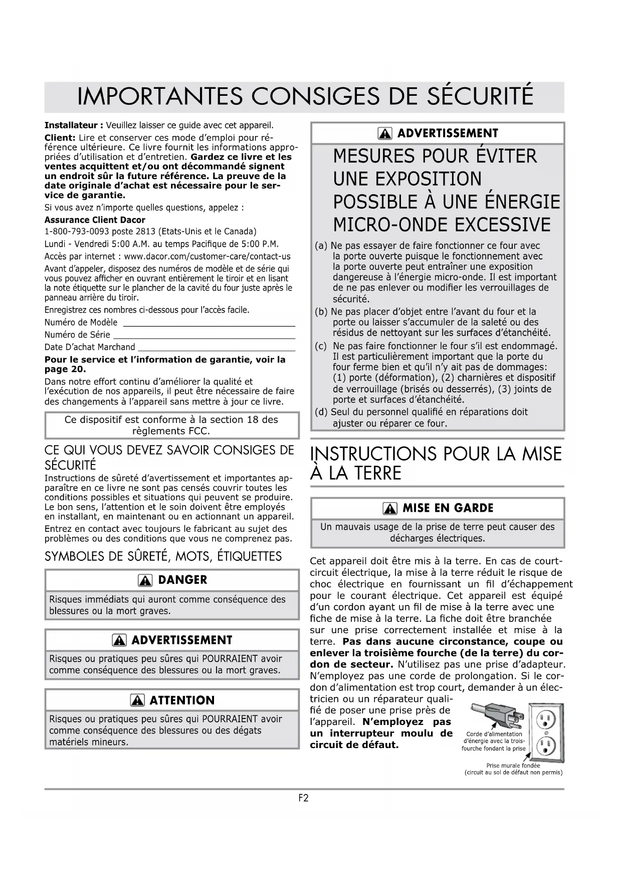 RATEUR DACOR AUTORISÉ. Lors de l’utilisation l’appareil, il faut prendre des mesures de sécurité élémentaires, y compris les suivantes : ADVERTISSEMENT Pour réduire le risque de brûlures, de choc électrique, de blessures personnelles et d’exposition excessive à l’énergie micro-onde :F4 Ce Que Vous Devez Savoir À Propos Du Déballage Et De L’inspection De Votre Microwave In-A-Drawer