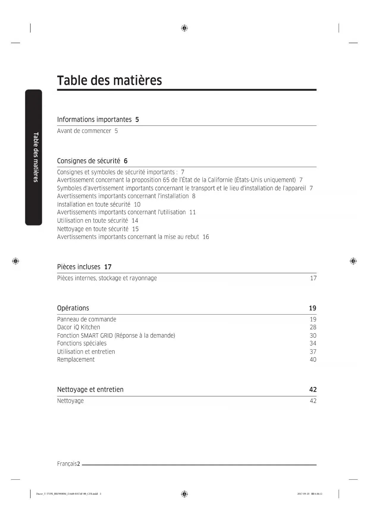- Ce réfrigérateur doit être correctement situé et installé conformément aux instructions du présent guide avant d'être utilisé. Dacor_T-TYPE_BRF9000M_DA68-03574F-00_CFR.indd 8 2017-09-20 6:36:12Français 9 Consignes de sécurité