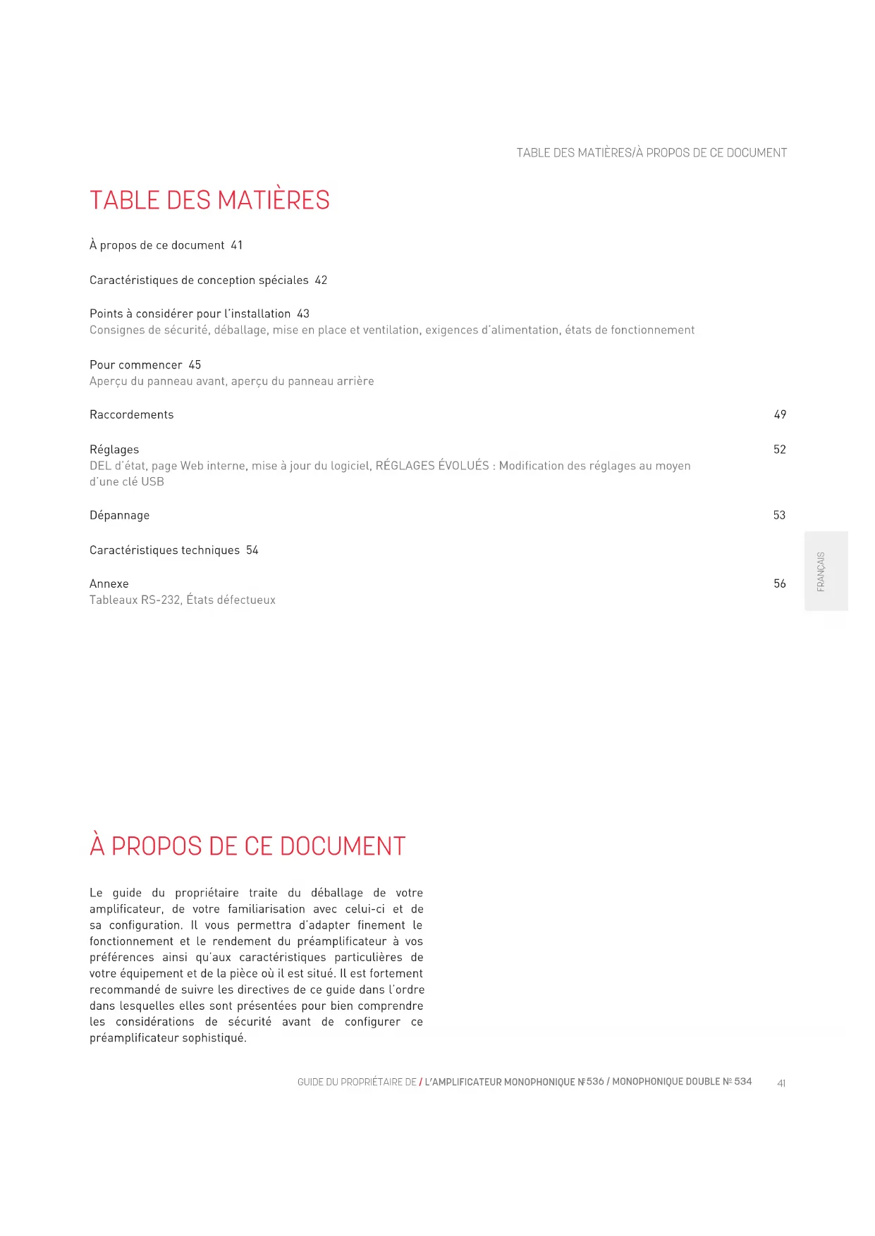 À propos de ce document 41 Caractéristiques de conception spéciales 42 Points à considérer pour l’installation 43 Consignes de sécurité, déballage, mise en place et ventilation, exigences d’alimentation, états de fonctionnement Pour commencer 45 Aperçu du panneau avant, aperçu du panneau arrière Raccordements 49 Réglages 52 DEL d’état, page Web interne, mise à jour du logiciel, RÉGLAGES ÉVOLUÉS: Modification des réglages au moyen d’une clé USB Dépannage 53 Caractéristiques techniques 54
