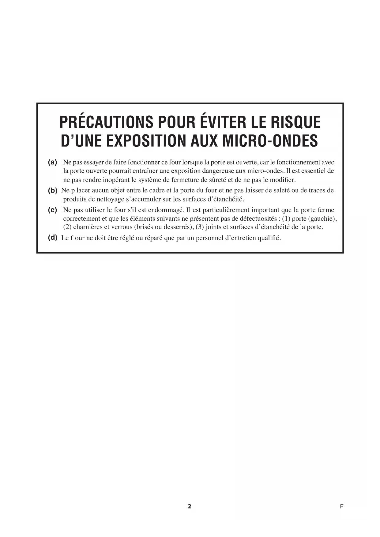 (a) Ne pas essayer de faire fonctionner ce four lorsque la porte est ouverte, car le fonctionnement avec la porte ouverte pourrait entraîner une exposition dangereuse aux micro-ondes. Il est essentiel de ne pas rendre inopérant le système de fermeture de sûreté et de ne pas le modier. (b) Ne p lacer aucun objet entre le cadre et la porte du four et ne pas laisser de saleté ou de traces de produits de nettoyage s’accumuler sur les surfaces d’étanchéité. (c) Ne pas utiliser le four s’il est endommagé. Il est particulièrement important que la porte ferme correctement et que les éléments suivants ne présentent pas de défectuosités : (1) porte (gauchie), (2) charnières et verrous (brisés ou desserrés), (3) joints et surfaces d’étanchéité de la porte. (d) Le f our ne doit être réglé ou réparé que par un personnel d’entretien qualié.