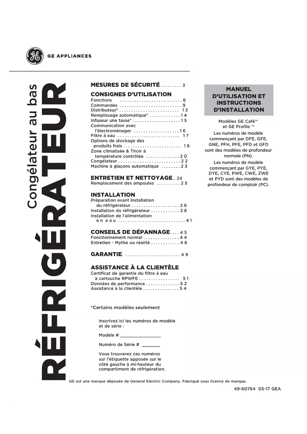 your phone number, or write to: ,QWKH86*HQHUDO0DQDJHU&XVWRPHU5HODWLRQV_*($SSOLDQFHV$SSOLDQFH3DUN_/RXLVYLOOH.< GEAppliances.com/ge/service-and-support/contact.htm ,Q&DQDGD'LUHFWRU&RQVXPHU5HODWLRQV0DEH&DQDGD,QF_6XLWH)DFWRU\/DQH_0RQFWRQ1%(&0 GEAppliances.ca/en/contact-us49-60764 05-17 GEA *Certains modèles seulement Inscrivez ici les numéros de modèle et de série : Modèle # ________________ Numéro de Série # _______ Vous trouverez ces numéros sur l’étiquette apposée sur le côté gauche à mi-hauteur du compartiment de réfrigération. MANUEL