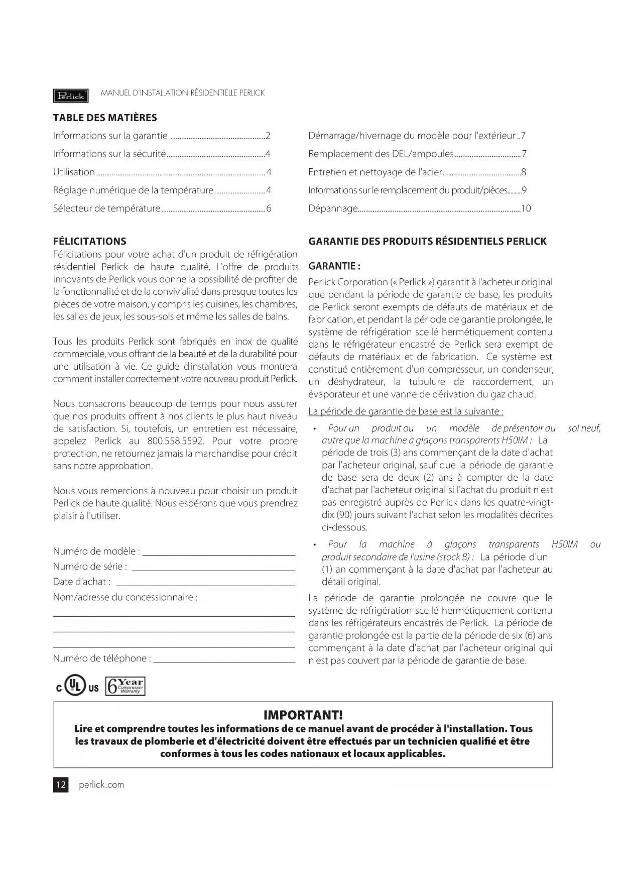 - Dépannage FÉLICITATIONS Félicitations pour votre achat d'un produit de réfrigération résidentiel Perlick de haute qualité. L'ore de produits innovants de Perlick vous donne la possibilité de proter de la fonctionnalité et de la convivialité dans presque toutes les pièces de votre maison, y compris les cuisines, les chambres, les salles de jeux, les sous-sols et même les salles de bains. Tous les produits Perlick sont fabriqués en inox de qualité commerciale, vous orant de la beauté et de la durabilité pour une utilisation à vie. Ce guide d'installation vous montrera comment installer correctement votre nouveau produit Perlick. Nous consacrons beaucoup de temps pour nous assurer que nos produits orent à nos clients le plus haut niveau de satisfaction. Si, toutefois, un entretien est nécessaire, appelez Perlick au 800.558.5592. Pour votre propre protection, ne retournez jamais la marchandise pour crédit sans notre approbation. Nous vous remercions à nouveau pour choisir un produit Perlick de haute qualité. Nous espérons que vous prendrez plaisir à l'utiliser. Numéro de modèle : _____________________________ Numéro de série : _______________________________ Date d’achat : __________________________________ Nom/adresse du concessionnaire : p. 10