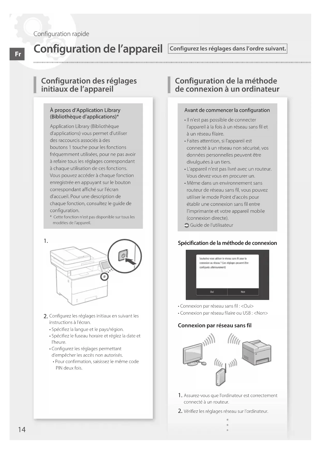 Configurez les réglages initiaux en suivant les instructions à l’écran.• Spécifiez la langue et le pays/région.• Spécifiez le fuseau horaire et réglez la date et l’heure.• Configurez les réglages permettant d’empêcher les accès non autorisés.• Pour confirmation, saisissez le même code PIN deux fois.Avant de commencer la configuration• Il n’est pas possible de connecter l’appareil à la fois à un réseau sans fil et à un réseau filaire.• Faites attention, si l’appareil est connecté à un réseau non sécurisé, vos données personnelles peuvent être divulguées à un tiers.• L’appareil n’est pas livré avec un routeur. Vous devez vous en procurer un.• Même dans un environnement sans routeur de réseau sans fil, vous pouvez utiliser le mode Point d’accès pour établir une connexion sans fil entre l’imprimante et votre appareil mobile (connexion directe). Guide de l’utilisateurSpécification de la méthode de connexion• Connexion par réseau sans fil: <Oui>• Connexion par réseau filaire ou USB: <Non>Connexion par réseau sans fil Assurez-vous que l’ordinateur est correctement connecté à un routeur. Vérifiez les réglages réseau sur l’ordinateur.
