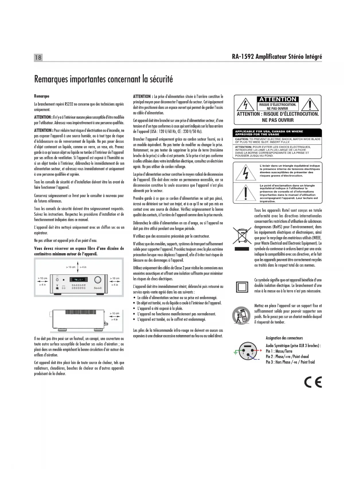 ins) Weight (net) 16.8 kg, 37.04 lbs. All specifications are accurate at the time of printing. Rotel reserves the right to make improvements without notice. Rotel and the Rotel Hi-Fi logo are registered trademarks of The Rotel Co, Ltd., Tokyo, Japan. “Made for iPod,” and “Made for iPhone,” means that an electronic accessory has been designed to connect specically to iPod or iPhone, respectively, and has been certied by the developer to meet Apple performance standards. Apple is not responsible for the operation of this device or its compliance with safety and regulatory standards. Please note that the use of this accessory with iPod, or iPhone may affect wireless performance. iPhone, iPod, iPod classic, iPod nano, and iPod touch are trademarks of Apple Inc., registered in the U.S. and other countries.18 RA‑1592 Amplicateur Stéréo Intégré RemarqueLe branchement repéré RS232 ne concerne que des techniciens agréés uniquement. ATTENTION : Il n’y a à l’intérieur aucune pièce susceptible d’être modifiée par l’utilisateur. Adressez‑vous impérativement à une personne qualifiée. ATTENTION : Pour réduire tout risque d’électrisation ou d’incendie, ne pas exposer l’appareil à une source humide, ou à tout type de risque d’éclaboussure ou de renversement de liquide. Ne pas poser dessus d’objet contenant un liquide, comme un verre, un vase, etc. Prenez garde à ce qu’aucun objet ou liquide ne tombe à l’intérieur de l’appareil par ses orifices de ventilation. Si l’appareil est exposé à l’humidité ou si un objet tombe à l’intérieur, débranchez‑le immédiatement de son alimentation secteur, et adressez‑vous immédiatement et uniquement à une personne qualifiée et agréée. Tous les conseils de sécurité et d’installation doivent être lus avant de faire fonctionner l’appareil. Conservez soigneusement ce livret pour le consulter à nouveau pour de futures références. Tous les conseils de sécurité doivent être soigneusement respectés. Suivez les instructions. Respectez les procédures d’installation et de fonctionnement indiquées dans ce manuel. L’appareil doit être nettoyé uniquement avec un chiffon sec ou un aspirateur. Ne pas utiliser cet appareil près d’un point d’eau. Vous devez réserver un espace libre d’une dizaine de centimètres minimum autour de l’appareil. Il ne doit pas être posé sur un fauteuil, un canapé, une couverture ou toute autre surface susceptible de boucher ses ouïes d’aération ; ou placé dans un meuble empêchant la bonne circulation d’air autour des orifices d’aération. Cet appareil doit être placé loin de toute source de chaleur, tels que radiateurs, chaudières, bouches de chaleur ou d’autres appareils produisant de la chaleur. ATTENTION