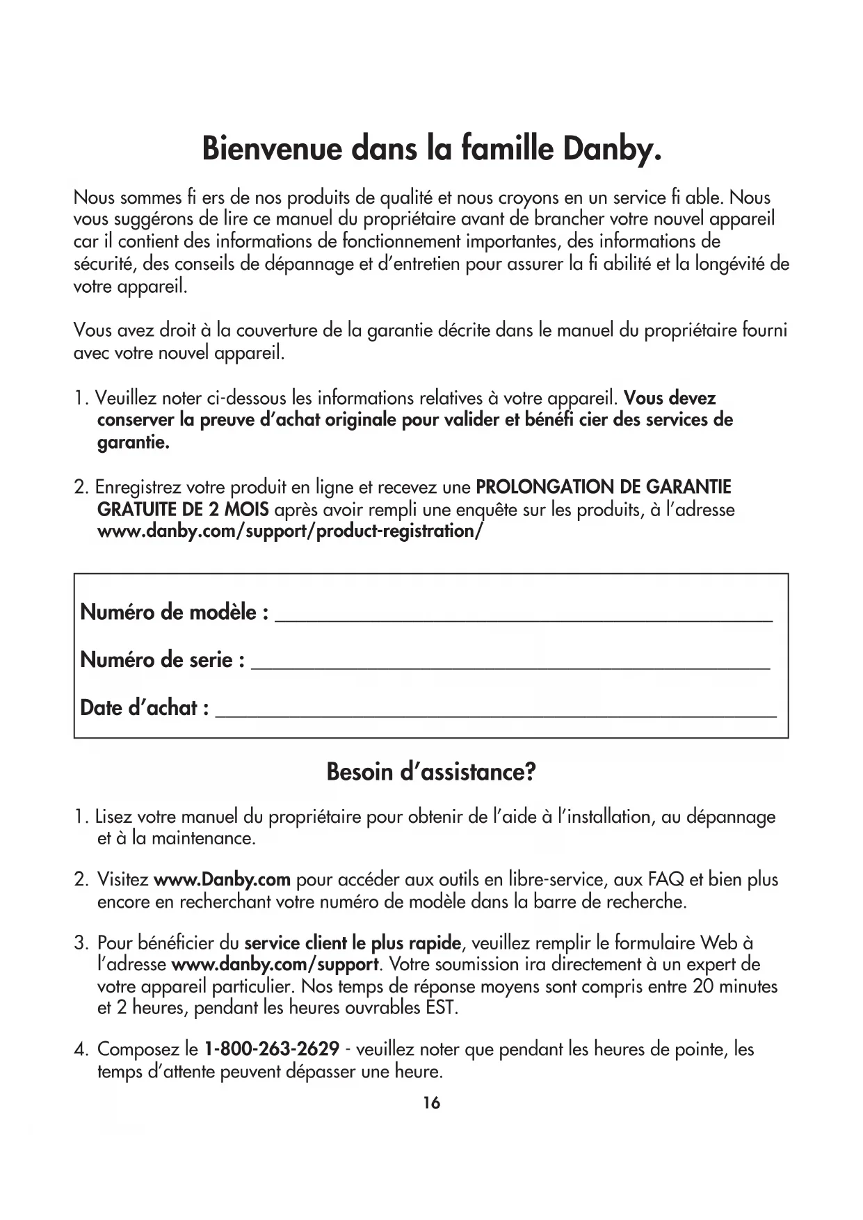 GRATUITE DE 2 MOIS après avoir rempli une enquête sur les produits, à l’adresse www.danby.com/support/product-registration/ Besoin d’assistance?