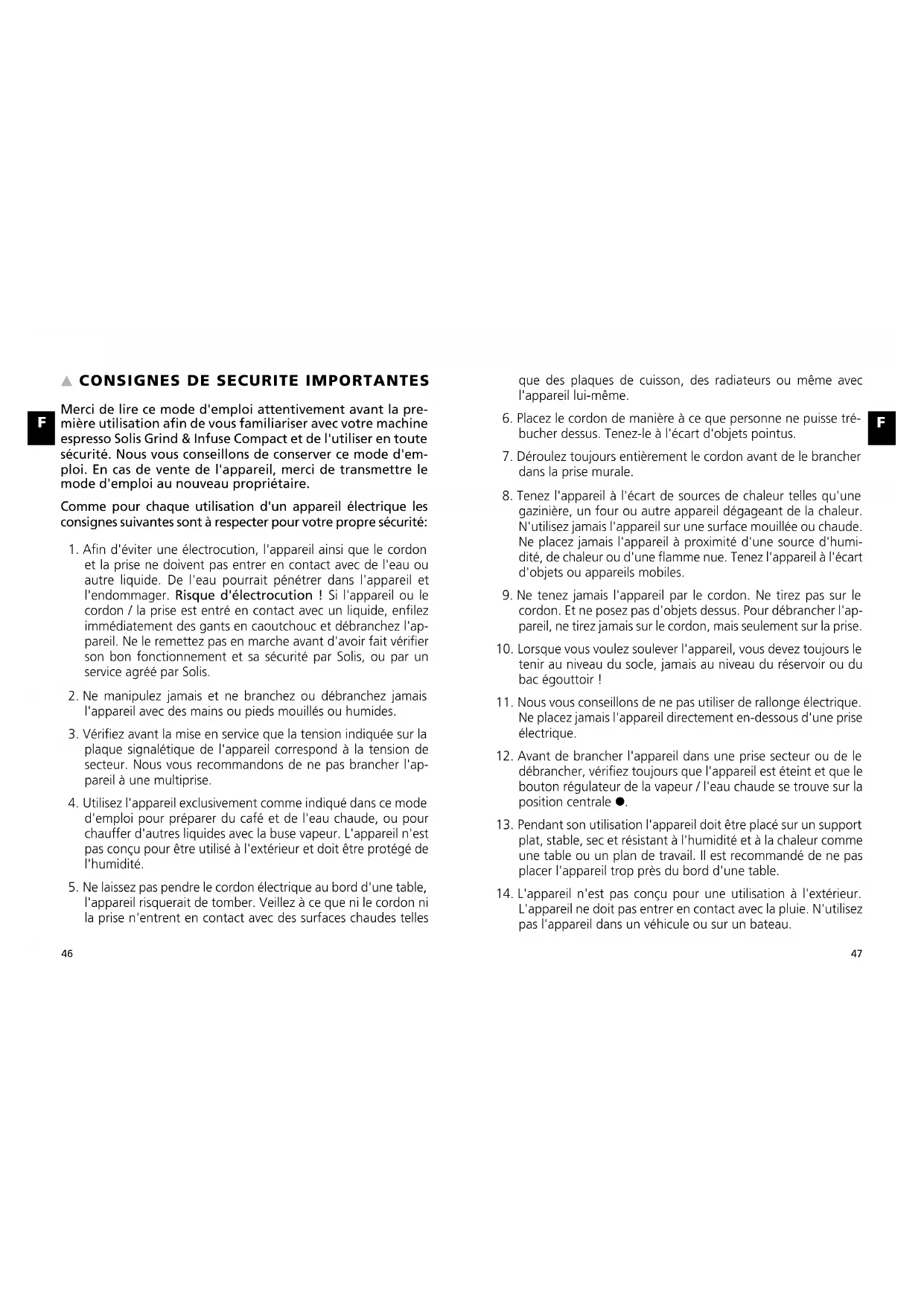 Merci de lire ce mode d'emploi attentivement avant la pre- mière utilisation afin de vous familiariser avec votre machine espresso Solis Grind & Infuse Compact et de l'utiliser en toute sécurité. Nous vous conseillons de conserver ce mode d'em- ploi. En cas de vente de l'appareil, merci de transmettre le mode d'emploi au nouveau propriétaire. Comme pour chaque utilisation d'un appareil électrique les consignes suivantes sont à respecter pour votre propre sécurité: