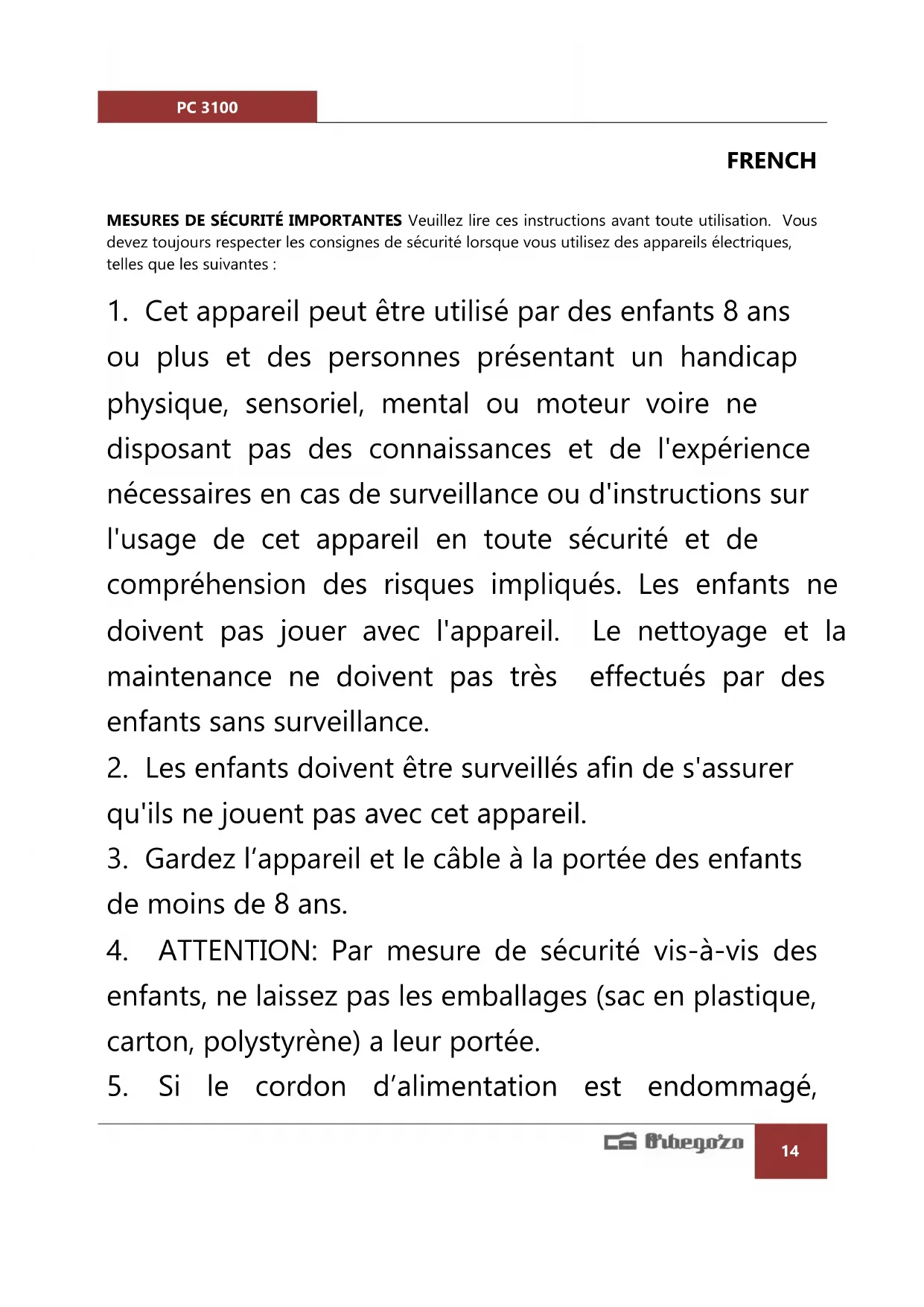 5. Si le cordon d’alimentation est endommagé,PC 3100
