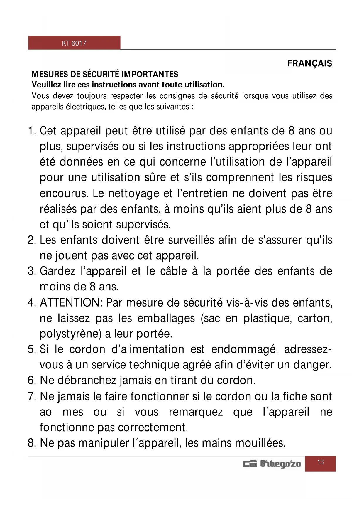 Retrouvez gratuitement la notice de l'appareil KT 6017 Orbegozo au format PDF.