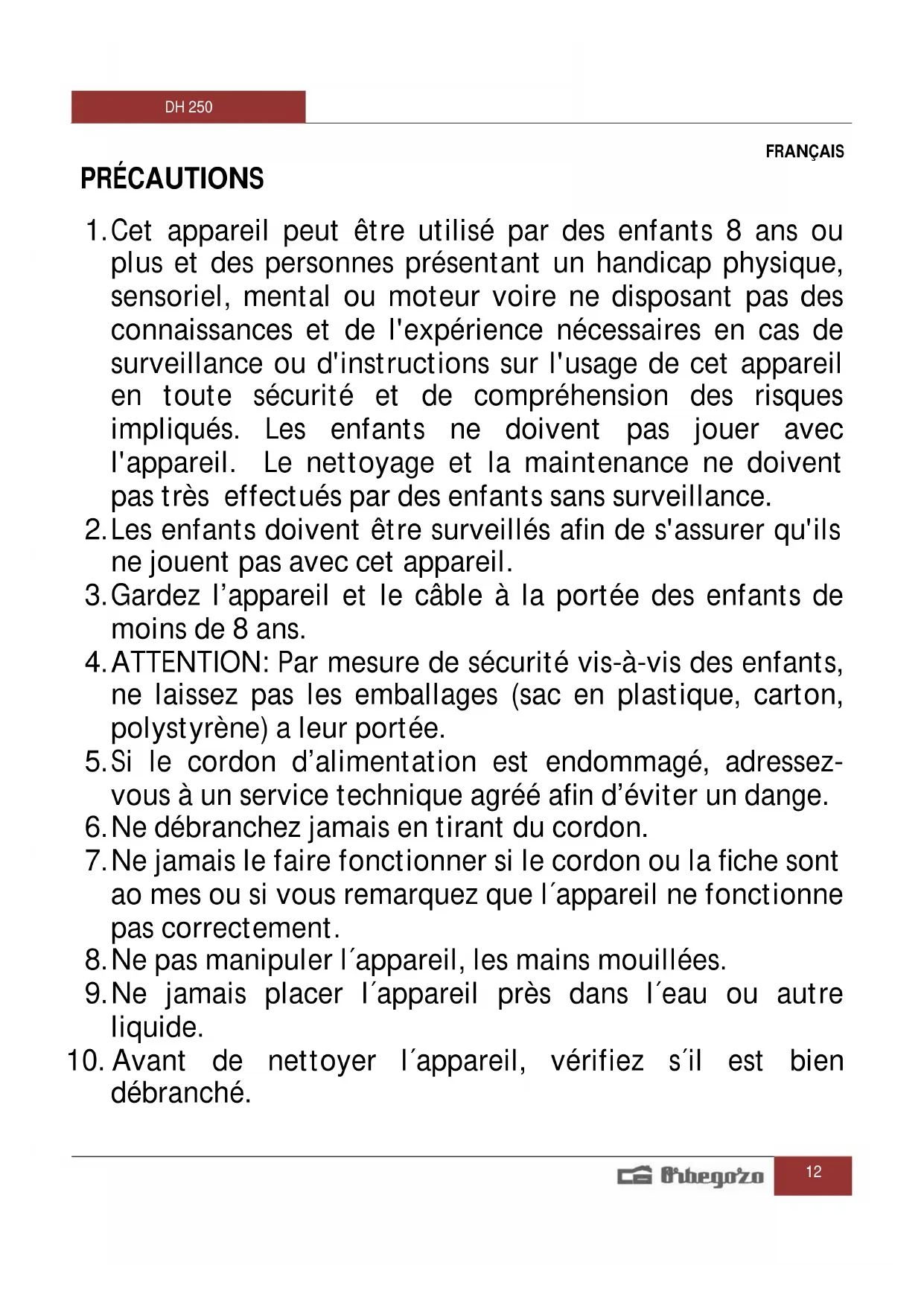 Retrouvez gratuitement la notice de l'appareil DH 250 Orbegozo au format PDF.