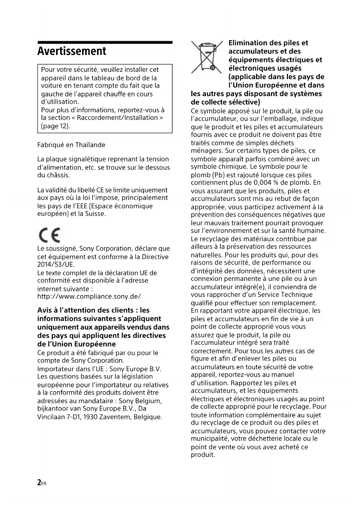 17GB For details, see “Detaching the Front Panel” (page 5). For details, see “Initializing the Unit” (page 7). When replacing the fuse, be sure to use one matching the amperage rating stated on the original fuse. If the fuse blows, check the power connection and replace the fuse. If the fuse blows again after replacement, there may be an internal malfunction. In such a case, consult your nearest Sony dealer. Detaching and attaching the front panel Initializing the unit Fuse replacement Fuse (15 A)2FR Avertissement Fabriqué en Thaïlande La plaque signalétique reprenant la tension d’alimentation, etc. se trouve sur le dessous du châssis. La validité du libellé CE se limite uniquement aux pays où la loi l’impose, principalement les pays de l’EEE (Espace économique européen) et la Suisse. Le soussigné, Sony Corporation, déclare que cet équipement est conforme à la Directive 2014/53/UE. Le texte complet de la déclaration UE de conformité est disponible à l’adresse internet suivante : http://www.compliance.sony.de/ Avis à l’attention des clients : les informations suivantes s’appliquent uniquement aux appareils vendus dans des pays qui appliquent les directives de l’Union Européenne Ce produit a été fabriqué par ou pour le compte de Sony Corporation. Importateur dans l’UE : Sony Europe B.V. Les questions basées sur la législation européenne pour l’importateur ou relatives à la conformité des produits doivent être adressées au mandataire : Sony Belgium, bijkantoor van Sony Europe B.V., Da Vincilaan 7-D1, 1930 Zaventem, Belgique. Elimination des piles et accumulateurs et des équipements électriques et électroniques usagés (applicable dans les pays de l’Union Européenne et dans les autres pays disposant de systèmes de collecte sélective) Ce symbole apposé sur le produit, la pile ou l’accumulateur, ou sur l’emballage, indique que le produit et les piles et accumulateurs fournis avec ce produit ne doivent pas être traités comme de simples déchets ménagers. Sur certains types de piles, ce symbole apparaît parfois combiné avec un symbole chimique. Le symbole pour le plomb (Pb) est rajouté lorsque ces piles contiennent plus de 0,004 % de plomb. En vous assurant que les produits, piles et accumulateurs sont mis au rebut de façon appropriée, vous participez activement à la prévention des conséquences négatives que leur mauvais traitement pourrait provoquer sur l’environnement et sur la santé humaine. Le recyclage des matériaux contribue par ailleurs à la préservation des ressources naturelles. Pour les produits qui, pour des raisons de sécurité, de performance ou d’intégrité des données, nécessitent une connexion permanente à une pile ou à un accumulateur intégré(e), il conviendra de vous rapprocher d’un Service Technique qualifié pour effectuer son remplacement. En rapportant votre appareil électrique, les piles et accumulateurs en fin de vie à un point de collecte approprié vous vous assurez que le produit, la pile ou l’accumulateur intégré sera traité correctement. Pour tous les autres cas de figure et afin d’enlever les piles ou accumulateurs en toute sécurité de votre appareil, reportez-vous au manuel d’utilisation. Rapportez les piles et accumulateurs, et les équipements électriques et électroniques usagés au point de collecte approprié pour le recyclage. Pour toute information complémentaire au sujet du recyclage de ce produit ou des piles et accumulateurs, vous pouvez contacter votre municipalité, votre déchetterie locale ou le point de vente où vous avez acheté ce produit. Pour votre sécurité, veuillez installer cet appareil dans le tableau de bord de la voiture en tenant compte du fait que la gauche de l’appareil chauffe en cours d’utilisation. Pour plus d’informations, reportez-vous à la section « Raccordement/Installation » (page 12).3FR ATTENTION La plage de fréquences suivante 65 – 74 MHz n’est pas affectée à la diffusion du son dans la table des affectations communes européennes et ne peut pas être utilisée en Europe. Avis d’exclusion de responsabilité relatif aux services proposés par des tiers Les services proposés par des tiers peuvent être modifiés, suspendus ou clôturés sans avis préalable. Sony n’assume aucune responsabilité dans ce genre de situation. Attention SONY NE PEUT ÊTRE, EN AUCUN CAS, TENU