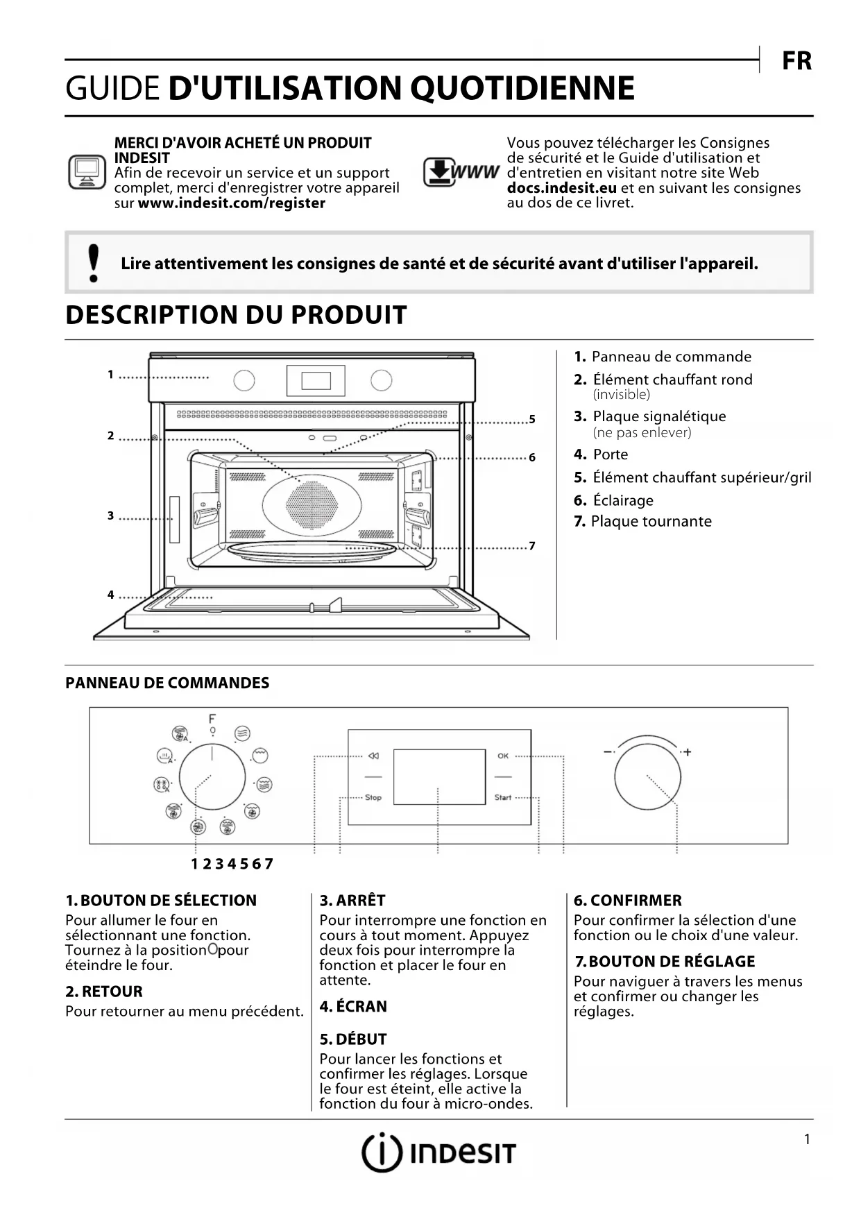Lire attentivement les consignes de santé et de sécurité avant d'utiliser l'appareil. MERCI D'AVOIR ACHETÉ UN PRODUIT INDESITAfin de recevoir un service et un support complet, merci d'enregistrer votre appareil sur www.indesit.com/register WWW Vous pouvez télécharger les Consignes de sécurité et le Guide d'utilisation et d'entretien en visitant notre site Web docs.indesit.eu et en suivant les consignes au dos de ce livret.