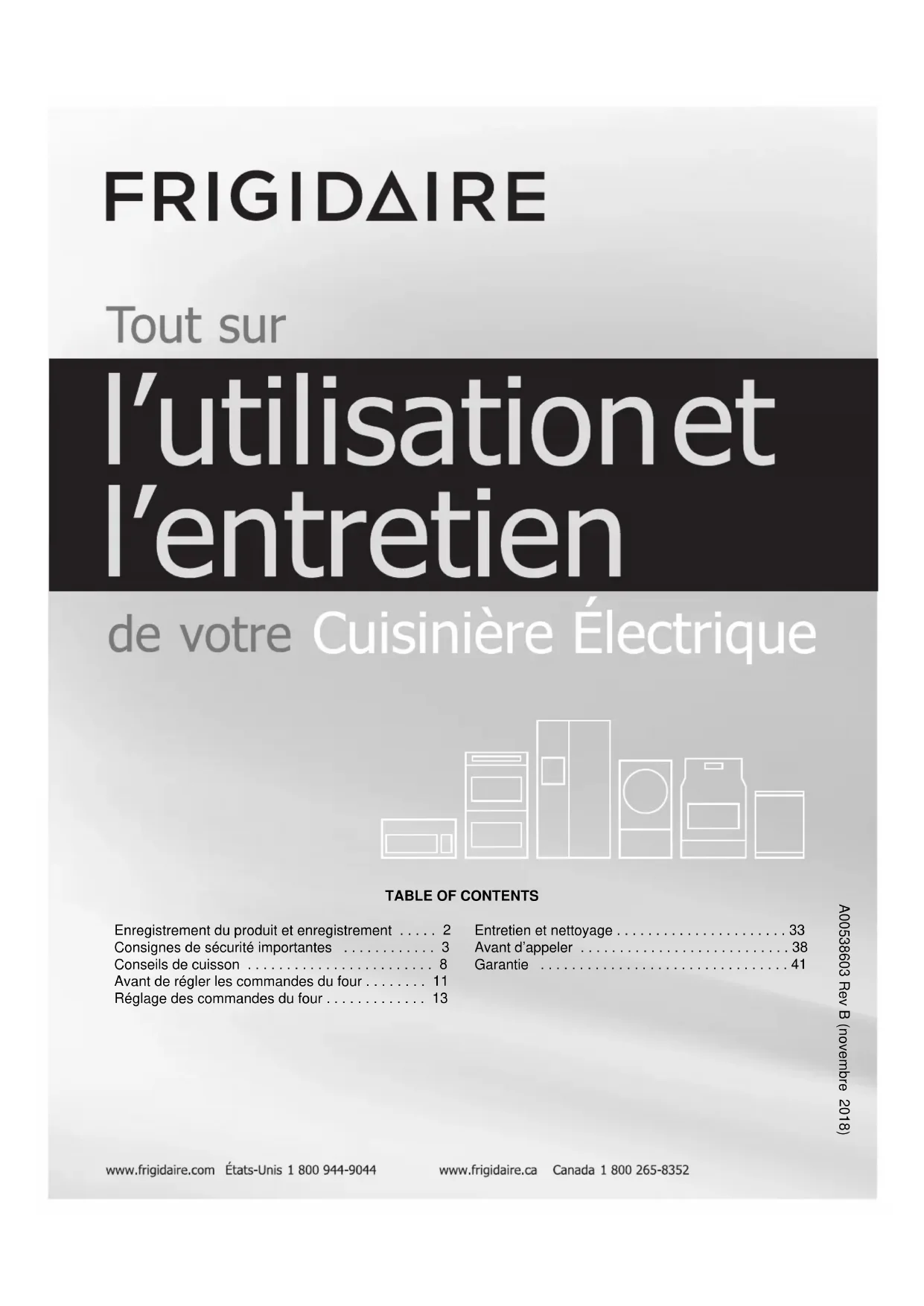Des questions? Pour joindre sans frais le service de soutien technique aux États-Unis et au Canada, téléphonez au 1-800-944-9044. Pour obtenir de l’aide et des renseignements en ligne sur les produits, rendez-vous à l’adresse http://www.frigidaire.com. Merci d’avoir choisi Frigidaire.Ce guide d’utilisation et d’entretien fait partie de notre engagement à vous satisfaire et à vous fournir un produit de qualité pendant toute la durée de vie de votre nouvel appareil. Nous considérons votre achat comme le début d’une relation. Pour vous assurer que nous pourrons continuer à vous servir, veuillez inscrire sur cette page les renseignements importants concernant ce produit.3