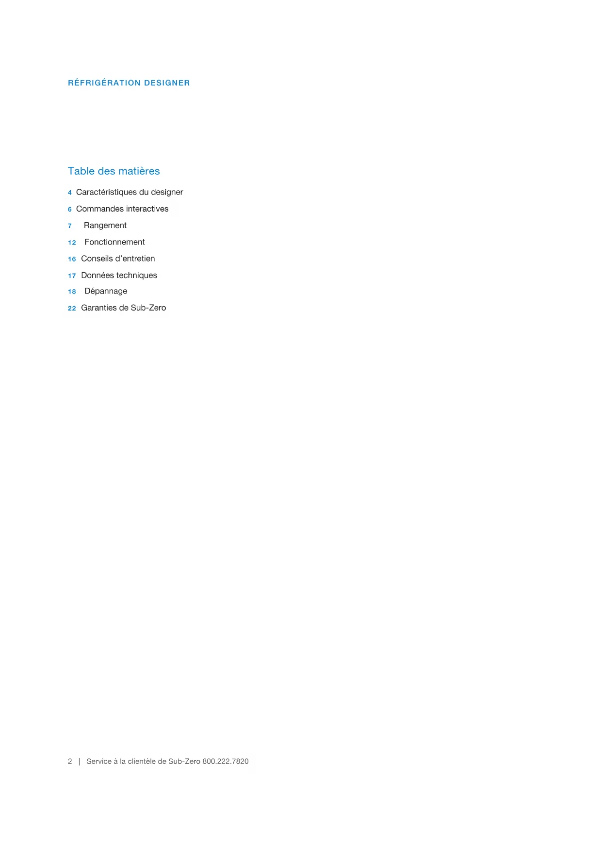 Table des matières 4 Caractéristiques du designer 6 Commandes interactives 7 Rangement 12 Fonctionnement 16 Conseils d’entretien 17 Données techniques 18 Dépannage 22 Garanties de Sub-Zerosubzero.com | 3 Service à la clientèle Le numéro de modèle et le numéro de série sont imprimés sur la che d’enregistrement du produit ci-jointe. Les deux numéros sont aussi indiqués sur la plaque signalétique du produit. Reportez-vous à la page 5 pour connaître l’emplacement de la plaque signalétique. Pour les besoins de la garantie, vous devrez aussi avoir la date d’installation et le nom de votre dépositaire Sub-Zero autorisé. Inscrivez ces renseignements ci-dessous pour consultation ultérieure.