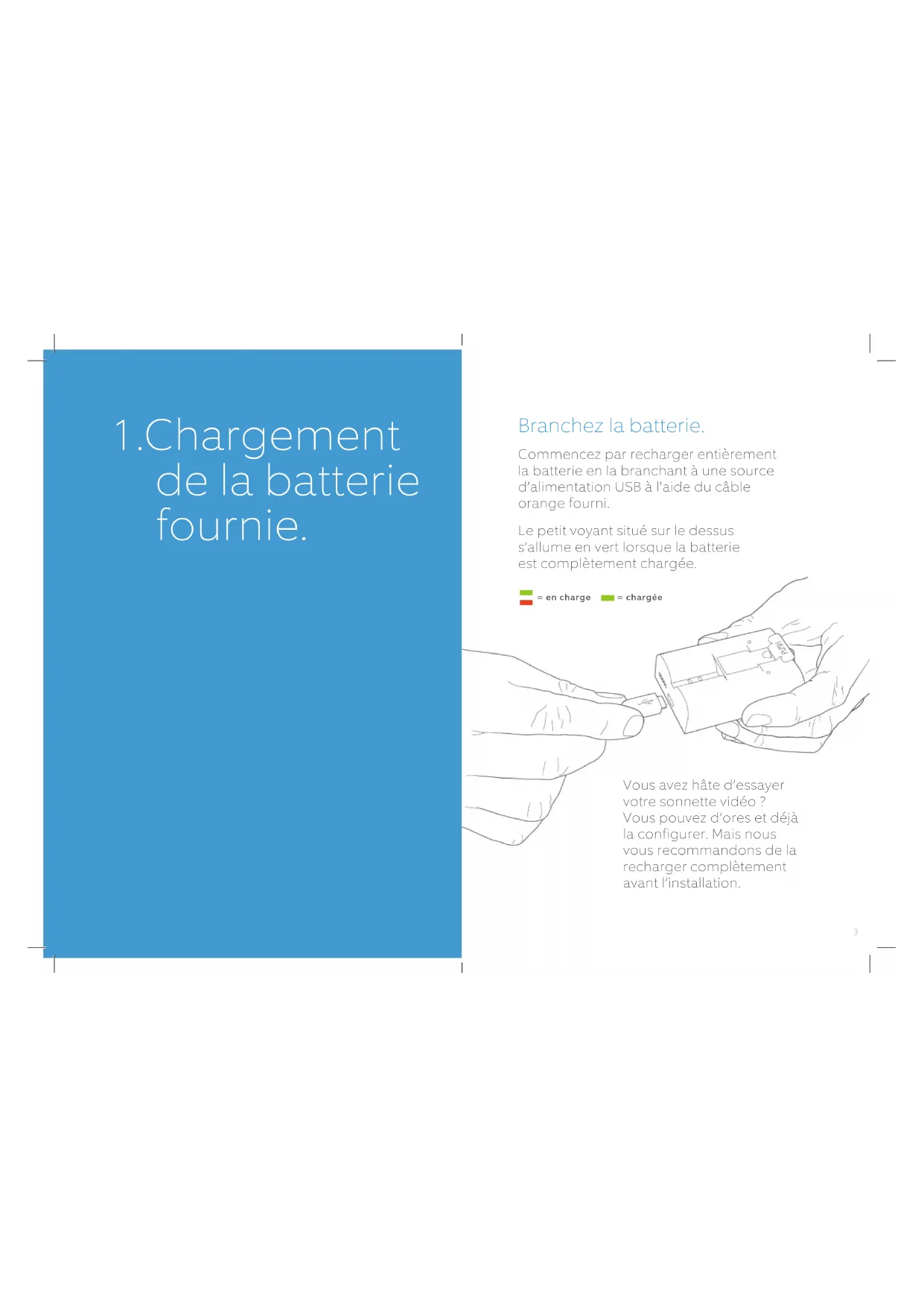 Video Doorbell 3Branchez la batterie. Commencez par recharger entièrement la batterie en la branchant à une source d’alimentation USB à l’aide du câble orange fourni. Le petit voyant situé sur le dessus s’allume en vert lorsque la batterie est complètement chargée. Vous avez hâte d’essayer votre sonnette vidéo ? Vous pouvez d’ores et déjà la configurer. Mais nous vous recommandons de la recharger complètement avant l’installation.