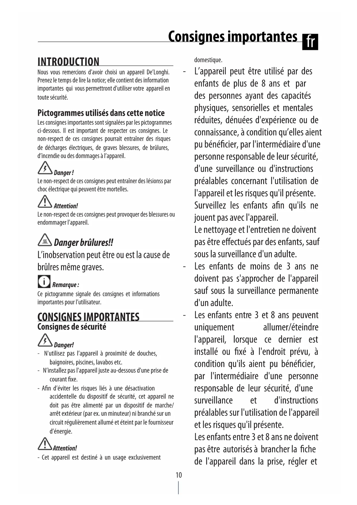 INTRODUCTION Nous vous remercions d’avoir choisi un appareil De’Longhi. Prenez le temps de lire la notice; elle contient des information importantes qui vous permettront d’utiliser votre appareil en toute sécurité. Pictogrammes utilisés dans cette notice Les consignes importantes sont signalées par les pictogrammes ci-dessous. Il est important de respecter ces consignes. Le non-respect de ces consignes pourrait entraîner des risques de décharges électriques, de graves blessures, de brûlures, d’incendie ou des dommages à l’appareil. Danger !Le non-respect de ces consignes peut entraîner des lésionss par choc électrique qui peuvent être mortelles. Attention!Le non-respect de ces consignes peut provoquer des blessures ou endommager l’appareil. Danger brûlures!! L’inobservation peut être ou est la cause de brûlres même graves. Remarque :Ce pictogramme signale des consignes et informations importantes pour l’utilisateur. CONSIGNES IMPORTANTES Consignes de sécurité Danger!- N'utilisez pas l’appareil à proximité de douches, baignoires, piscines, lavabos etc.- N’installez pas l'appareil juste au-dessous d'une prise de courant xe.- An d’éviter les risques liés à une désactivation accidentelle du dispositif de sécurité, cet appareil ne doit pas être alimenté par un dispositif de marche/ arrêt extérieur (par ex. un minuteur) ni branché sur un circuit régulièrement allumé et éteint par le fournisseur d’énergie. Attention!- Cet appareil est destiné à un usage exclusivement domestique. - L’appareil peut être utilisé par des enfants de plus de 8 ans et par des personnes ayant des capacités physiques, sensorielles et mentales réduites, dénuées d'expérience ou de connaissance, à condition qu’elles aient pu bénécier, par l'intermédiaire d'une personne responsable de leur sécurité, d'une surveillance ou d'instructions préalables concernant l'utilisation de l'appareil et les risques qu'il présente. Surveillez les enfants an qu'ils ne jouent pas avec l'appareil. Le nettoyage et l'entretien ne doivent pas être eectués par des enfants, sauf sous la surveillance d'un adulte. - Les enfants de moins de 3 ans ne doivent pas s'approcher de l'appareil sauf sous la surveillance permanente d'un adulte. - Les enfants entre 3 et 8 ans peuvent uniquement allumer/éteindre l'appareil, lorsque ce dernier est installé ou xé à l'endroit prévu, à condition qu'ils aient pu bénécier, par l'intermédiaire d'une personne responsable de leur sécurité, d'une surveillance et d'instructions préalables sur l'utilisation de l'appareil et les risques qu'il présente. Les enfants entre 3 et 8 ans ne doivent pas être autorisés à brancher la che de l'appareil dans la prise, régler et Consignes importantes fr11 nettoyer l'appareil ou en eectuer l'entretien. ATTENTION: Certaines parties de l'appareil peuvent devenir très chaudes et provoquer des brûlures. Il est impératif de prendre toutes les précautions en présence d'enfants ou de personnes vulnérables. - Il est préférable de ne pas utiliser de rallonge. Si l'utilisation d'une rallonge s'avère nécessaire, suivez attentivement les instructions gurant sur celle-ci, en veillant à ne dépasser la puissance maximale indiquée sur la rallonge. - Si le câble d’alimentation est endommagé, faites-le remplacer par le fabricant, un centre service agréé ou par un professionnel qualié an d’éviter tout risque.- N'utilisez pas cet appareil dans une pièce de moins de 4 m². - Avant de ranger l'appareil assurez-vous qu'il est bien éteint et débranché de la prise. Enroulez le câble autour de la base. Ne rangez pas l'appareil dans un endroit poussiéreux. Danger brûlures!!- Ne couvrez pas l’appareil pendant son fonctionnement, cela pourrait provoquer un incendie.- N'utilisez pas le radiateur souant pour sécher du linge. Ne bouchez pas les grilles d'entrée et de sortie de l'air (danger de surchaue).- Placez l'appareil à une distance de 50 cm au moins de meubles, murs, rideaux ou autres objets.- Lorsque vous utilisez l’appareil en version mobile, évitez de l’installer contre un mur, un meuble, un rideau, etc. Remarque :- Utilisez l’appareil exclusivement en position verticale.- Un dispositif thermique de sécurité arrête l’appareil en cas de surchaue accidentelle (par ex. obstruction des grilles d’entrée et de sortie de l’air, moteur qui ne tourne pas ou qui tourne lentement). Pour remettre l’appareil en marche, débranchez-le quelques minutes, éliminez la cause de la surchaue et rebranchez-le.- Ne posez rien sur l'appareil. IMPORTANT: Ne couvrez pas l'appareil pendant son fonctionnement, car cela pourrait provoquer une dangereuse surchaue de celui-ci. Mise au rebut de l’appareil Conformément à la directive européenne 2002/96/CE, ne jetez pas l’appareil avec les déchets domestiques, mais portez-le à un centre de collecte sélective agréé. UTILISATION Description A Lampe témoinB Sélecteur de fonctionsC ThermostatD Minuterie (pas pour tous les modèles) Raccordement électrique - Avant de brancher l’appareil, vériez attentivement si la tension de secteur correspond à la valeur en Volts (V) indiquée sur l’appareil et si la prise de courant et la ligne d'alimentation peuvent supporter l’intensité requise. - CET APPAREIL EST CONFORME À LA DIRECTIVE 2004/108/CE SUR LA COMPATIBILITÉ ÉLECTROMAGNÉTIQUE. Installation L’appareil peut être utilisé dans sa conguration portable ou xé au mur, s’il est doté de support. Pour la xation murale, procédez de la façon suivante: - Fixez le support mural en respectant les mesures minimales indiquées g. 2. Si vous utilisez l’appareil dans la salle de bains, respectez le « volume de protection » (voir g.1) et installez-le loin des robinets, lavabos, douches, etc. - Insérez l’appareil dans le crochet supérieur du support et tournez-le légèrement jusqu’à l’accrocher à l’ergot inférieur