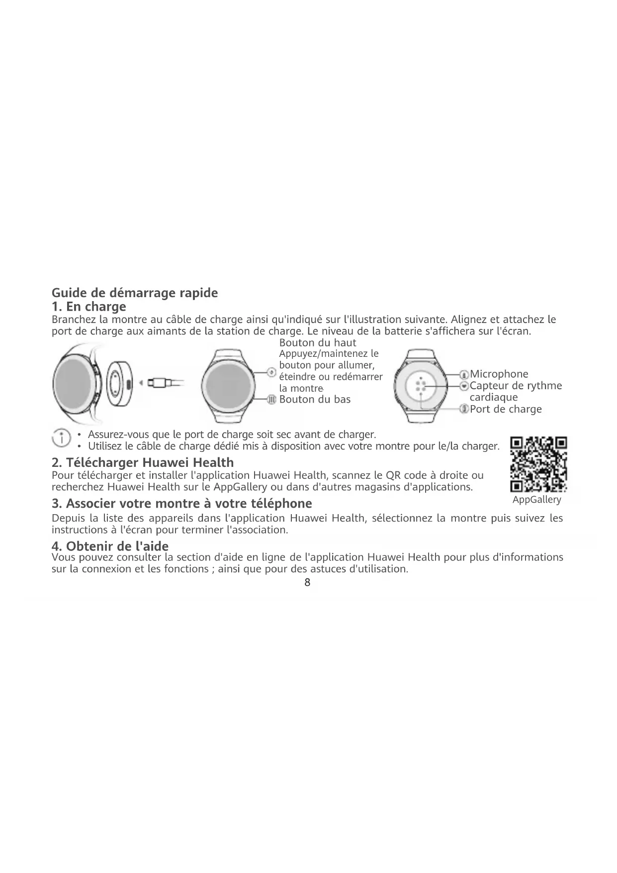 Bouton du bas Microphone Capteur de rythme cardiaque Port de charge Pour télécharger et installer l'application Huawei Health, scannez le QR code à droite ou recherchez Huawei Health sur le AppGallery ou dans d'autres magasins d'applications. AppGallery8 9 Copyright © Huawei Technologies Co., Ltd. 2020. Tous droits réservés. CE DOCUMENT EST FOURNI À TITRE INFORMATIF UNIQUEMENT. IL NE CONSTITUE AUCUNE FORME DE GARANTIE. Marques déposées et autorisations , et sont des marques protégées ou déposées de Huawei Technologies Co., Ltd. Le nom et les logos Bluetooth