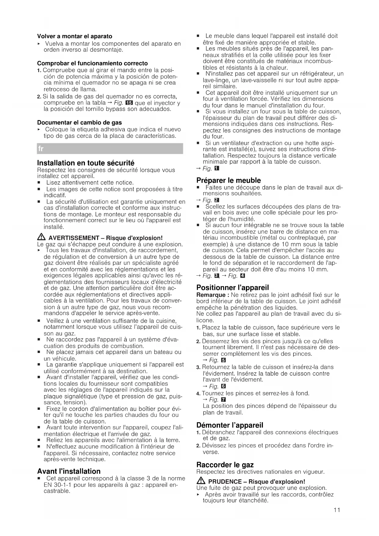 Installation en toute sécurité Respectez les consignes de sécurité lorsque vous installez cet appareil. ¡ Lisez attentivement cette notice. ¡ Les images de cette notice sont proposées à titre indicatif. ¡ La sécurité d'utilisation est garantie uniquement en cas d'installation correcte et conforme aux instruc- tions de montage. Le monteur est responsable du fonctionnement correct sur le lieu où l'appareil est installé. AVERTISSEMENT‒Risque d'explosion! Le gaz qui s’échappe peut conduire à une explosion. ▶ Tous les travaux d'installation, de raccordement, de régulation et de conversion à un autre type de gaz doivent être réalisés par un spécialiste agréé et en conformité avec les réglementations et les exigences légales applicables ainsi qu'avec les ré- glementations des fournisseurs locaux d'électricité et de gaz. Une attention particulière doit être ac- cordée aux réglementations et directives appli- cables à la ventilation. Pour les travaux de conver- sion à un autre type de gaz, nous vous recom- mandons d'appeler le service après-vente. ¡ Veillez à une ventilation suffisante de la cuisine, notamment lorsque vous utilisez l’appareil de cuis- son au gaz. ¡ Ne raccordez pas l'appareil à un système d'éva- cuation des produits de combustion. ¡ Ne placez jamais cet appareil dans un bateau ou un véhicule. ¡ La garantie s'applique uniquement si l'appareil est utilisé conformément à sa destination. ¡ Avant d'installer l'appareil, vérifiez que les condi- tions locales du fournisseur sont compatibles avec les réglages de l'appareil indiqués sur la plaque signalétique (type et pression de gaz, puis- sance, tension). ¡ Fixez le cordon d'alimentation au boîtier pour évi- ter qu'il ne touche les parties chaudes du four ou de la table de cuisson. ¡ Avant toute intervention sur l'appareil, coupez l'ali- mentation électrique et l'arrivée de gaz. ¡ Reliez les appareils avec l'alimentation à la terre. ¡ N'effectuez aucune modification à l'intérieur de l'appareil. Si nécessaire, contactez notre service après-vente technique. Avant l'installation ¡ Cet appareil correspond à la classe 3 de la norme EN 30-1-1 pour les appareils à gaz: appareil en- castrable. ¡ Le meuble dans lequel l'appareil est installé doit être fixé de manière appropriée et stable. ¡ Les meubles situés près de l'appareil, les pan- neaux stratifiés et la colle utilisée pour les fixer doivent être constitués de matériaux incombus- tibles et résistants à la chaleur. ¡ N'installez pas cet appareil sur un réfrigérateur, un lave-linge, un lave-vaisselle ni sur tout autre appa- reil similaire. ¡ Cet appareil doit être installé uniquement sur un four à ventilation forcée. Vérifiez les dimensions du four dans le manuel d'installation du four. ¡ Si vous installez un four sous la table de cuisson, l'épaisseur du plan de travail peut différer des di- mensions indiquées dans ces instructions. Res- pectez les consignes des instructions de montage du four. ¡ Si un ventilateur d'extraction ou une hotte aspi- rante est installé(e), suivez ses instructions d'ins- tallation. Respectez toujours la distance verticale minimale par rapport à la table de cuisson.
