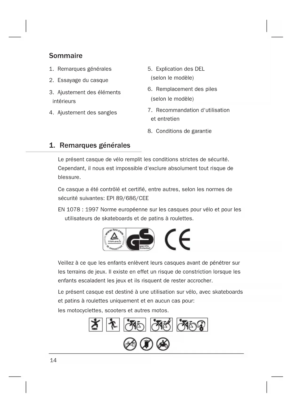 Le présent casque de vélo remplit les conditions strictes de sécurité. Cependant, il nous est impossible d‘exclure absolument tout risque de blessure. Ce casque a été contrôlé et certié, entre autres, selon les normes de sécurité suivantes: EPI 89/686/CEE EN 1078 : 1997 Norme européenne sur les casques pour vélo et pour les utilisateurs de skateboards et de patins à roulettes. Veillez à ce que les enfants enlèvent leurs casques avant de pénétrer sur les terrains de jeux. Il existe en effet un risque de constriction lorsque les enfants escaladent les jeux et ils risquent de rester accrocher. Le présent casque est destiné à une utilisation sur vélo, avec skateboards et patins à roulettes uniquement et en aucun cas pour: les motocyclettes, scooters et autres motos.
