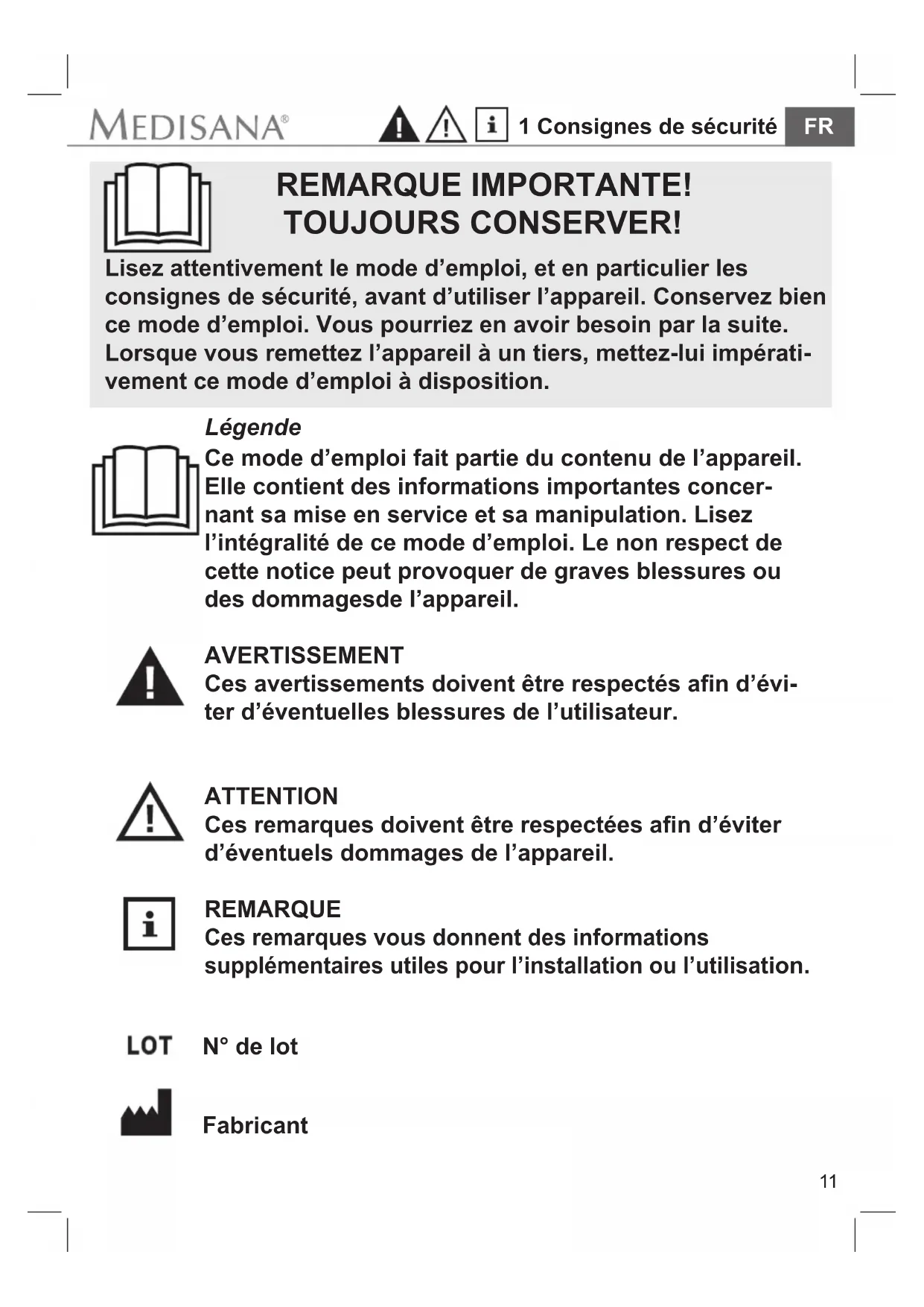 Légende Ce mode d’emploi fait partie du contenu de l’appareil. Elle contient des informations importantes concer- nant sa mise en service et sa manipulation. Lisez l’intégralité de ce mode d’emploi. Le non respect de cette notice peut provoquer de graves blessures ou des dommagesde l’appareil. AVERTISSEMENT Ces avertissements doivent être respectés an d’évi- ter d’éventuelles blessures de l’utilisateur. ATTENTION Ces remarques doivent être respectées an d’éviter d’éventuels dommages de l’appareil. REMARQUE Ces remarques vous donnent des informations supplémentaires utiles pour l’installation ou l’utilisa tion. N° de lot