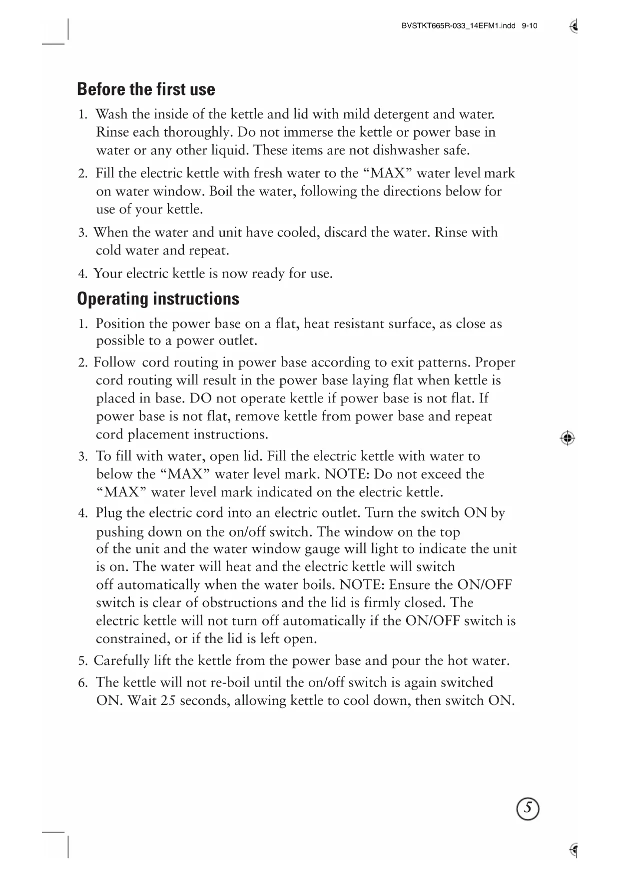 BVSTKT665R-033_14EFM1.indd 9-10 1/16/14 10:22 AMEN CAS D’ÉVAPORATION TOTALE Si la bouilloire est utilisée conformément au mode d’emploi préconisé, il serait surprenant que l’eau s’évapore totalement. Pour pallier une telle éventualité, la bouilloire incorpore un dispositif de protection infaillible qui met automatiquement la bouilloire hors tension quand le capteur perçoit l’absence d’eau, d’une part, et qui empêche la remise en marche tant que la verseuse ne contient pas au moins le volume minimal d’eau, d’autre part. Laissez toujours refroidir la bouilloire pendant une demi-heure avant de recommencer à vous en servir après l’évaporation totale. Instructions relatives au filtre La bouilloire comprend un filtre ayant pour fonction d’arrêter le tartre et les résidus en suspension dans l’eau, afin que ceux-ci n’altèrent pas le goût des boissons et des aliments. Amovible, ce filtre se nettoie facilement. Pour limiter l’entartrage, videz toujours la bouilloire quand vous faites chauffer trop d’eau. La fréquence de nettoyage du filtre dépend de la nature de l’eau de votre région et de la fréquence d’emploi de la bouilloire. Le filtre devrait être nettoyé lorsque vous voyez du tartre sur le filtre et tout particulièrement lorsque vous remarquez que le débit d’eau diminue. Retrait, nettoyage et remise en place du filtre Important: Réglez la bouilloire à l’arrêt, débranchez-la et laissez-la refroidir complètement avant de retirer le filtre ou de le replacer. N’usez pas de force, vous pourriez abîmer le filtre ou le couvercle.