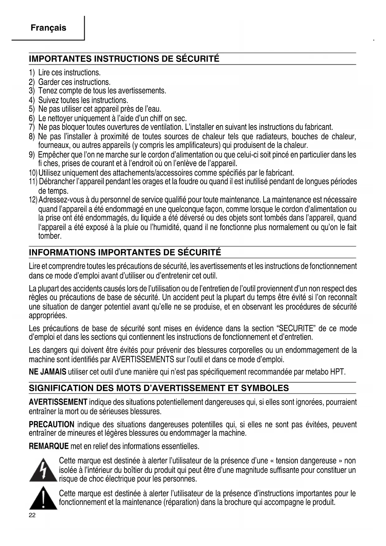 Lire et comprendre toutes les précautions de sécurité, les avertissements et les instructions de fonctionnement dans ce mode d’emploi avant d’utiliser ou d’entretenir cet outil. La plupart des accidents causés lors de l’utilisation ou de l’entretien de l’outil proviennent d’un non respect des règles ou précautions de base de sécurité. Un accident peut la plupart du temps être évité si l’on reconnaît une situation de danger potentiel avant qu’elle ne se produise, et en observant les procédures de sécurité appropriées. Les précautions de base de sécurité sont mises en évidence dans la section “SECURITE” de ce mode d’emploi et dans les sections qui contiennent les instructions de fonctionnement et d’entretien. Les dangers qui doivent être évités pour prévenir des blessures corporelles ou un endommagement de la machine sont identifi és par AVERTISSEMENTS sur l’outil et dans ce mode d’emploi. NE JAMAIS utiliser cet outil d’une manière qui n’est pas spécifi quement recommandée par metabo HPT. SIGNIFICATION DES MOTS D’AVERTISSEMENT ET SYMBOLES AVERTISSEMENT indique des situations potentiellement dangereuses qui, si elles sont ignorées, pourraient entraîner la mort ou de sérieuses blessures. PRECAUTION indique des situations dangereuses potentilles qui, si elles ne sont pas évitées, peuvent entraîner de mineures et légères blessures ou endommager la machine. REMARQUE met en relief des informations essentielles. Cette marque est destinée à alerter l’utilisateur de la présence d’une « tension dangereuse » non isolée à l’intérieur du boîtier du produit qui peut être d’une magnitude suffi sante pour constituer un risque de choc électrique pour les personnes. Cette marque est destinée à alerter l’utilisateur de la présence d’instructions importantes pour le fonctionnement et la maintenance (réparation) dans la brochure qui accompagne le produit. 000BookUR18DSALUS.indb22000BookUR18DSALUS.indb22 2018/04/129:18:502018/04/129:18:50Français