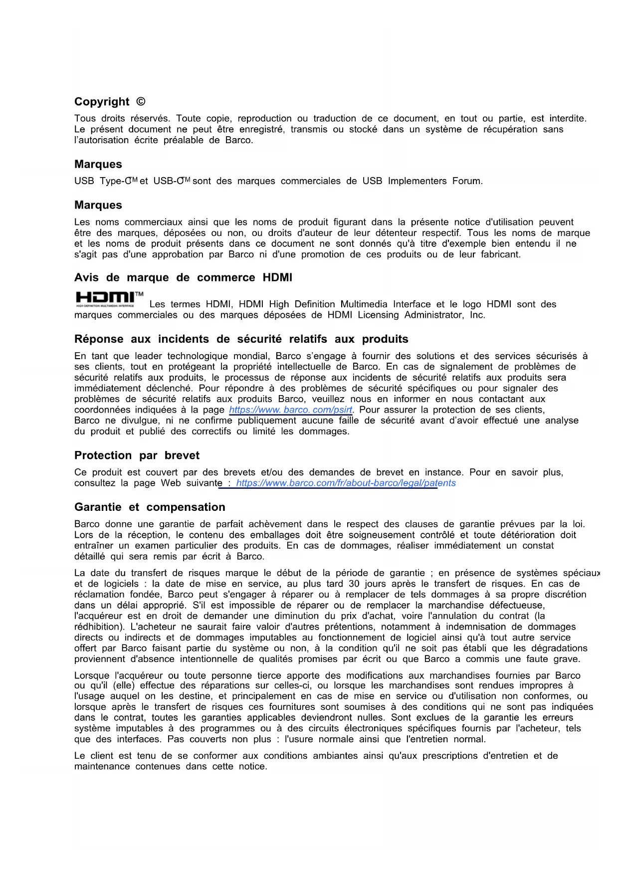 sont des marques commerciales de USB Implementers Forum. Marques Les noms commerciaux ainsi que les noms de produit figurant dans la présente notice d'utilisation peuvent être des marques, déposées ou non, ou droits d'auteur de leur détenteur respectif. Tous les noms de marque et les noms de produit présents dans ce document ne sont donnés qu'à titre d'exemple bien entendu il ne s'agit pas d'une approbation par Barco ni d'une promotion de ces produits ou de leur fabricant. Avis de marque de commerce HDMI Les termes HDMI, HDMI High Definition Multimedia Interface et le logo HDMI sont des marques commerciales ou des marques déposées de HDMI Licensing Administrator, Inc. Réponse aux incidents de sécurité relatifs aux produits En tant que leader technologique mondial, Barco s’engage à fournir des solutions et des services sécurisés à ses clients, tout en protégeant la propriété intellectuelle de Barco. En cas de signalement de problèmes de sécurité relatifs aux produits, le processus de réponse aux incidents de sécurité relatifs aux produits sera immédiatement déclenché. Pour répondre à des problèmes de sécurité spécifiques ou pour signaler des problèmes de sécurité relatifs aux produits Barco, veuillez nous en informer en nous contactant aux coordonnées indiquées à la page https://www. barco. com/psirt. Pour assurer la protection de ses clients, Barco ne divulgue, ni ne confirme publiquement aucune faille de sécurité avant d’avoir effectué une analyse du produit et publié des correctifs ou limité les dommages. Protection par brevet Ce produit est couvert par des brevets et/ou des demandes de brevet en instance. Pour en savoir plus, consultez la page Web suivante : https://www.barco.com/fr/about-barco/legal/patents Garantie et compensation Barco donne une garantie de parfait achèvement dans le respect des clauses de garantie prévues par la loi. Lors de la réception, le contenu des emballages doit être soigneusement contrôlé et toute détérioration doit entraîner un examen particulier des produits. En cas de dommages, réaliser immédiatement un constat détaillé qui sera remis par écrit à Barco. La date du transfert de risques marque le début de la période de garantie ; en présence de systèmes spéciaux et de logiciels : la date de mise en service, au plus tard 30 jours après le transfert de risques. En cas de réclamation fondée, Barco peut s'engager à réparer ou à remplacer de tels dommages à sa propre discrétion dans un délai approprié. S'il est impossible de réparer ou de remplacer la marchandise défectueuse, l'acquéreur est en droit de demander une diminution du prix d'achat, voire l'annulation du contrat (la rédhibition). L'acheteur ne saurait faire valoir d'autres prétentions, notamment à indemnisation de dommages directs ou indirects et de dommages imputables au fonctionnement de logiciel ainsi qu'à tout autre service offert par Barco faisant partie du système ou non, à la condition qu'il ne soit pas établi que les dégradations proviennent d'absence intentionnelle de qualités promises par écrit ou que Barco a commis une faute grave. Lorsque l'acquéreur ou toute personne tierce apporte des modifications aux marchandises fournies par Barco ou qu'il (elle) effectue des réparations sur celles-ci, ou lorsque les marchandises sont rendues impropres à l'usage auquel on les destine, et principalement en cas de mise en service ou d'utilisation non conformes, ou lorsque après le transfert de risques ces fournitures sont soumises à des conditions qui ne sont pas indiquées dans le contrat, toutes les garanties applicables deviendront nulles. Sont exclues de la garantie les erreurs système imputables à des programmes ou à des circuits électroniques spécifiques fournis par l'acheteur, tels que des interfaces. Pas couverts non plus : l'usure normale ainsi que l'entretien normal. Le client est tenu de se conformer aux conditions ambiantes ainsi qu'aux prescriptions d'entretien et de maintenance contenues dans cette notice.Contrat de licence utilisateur final spécifique au produit de Barco ClickShare