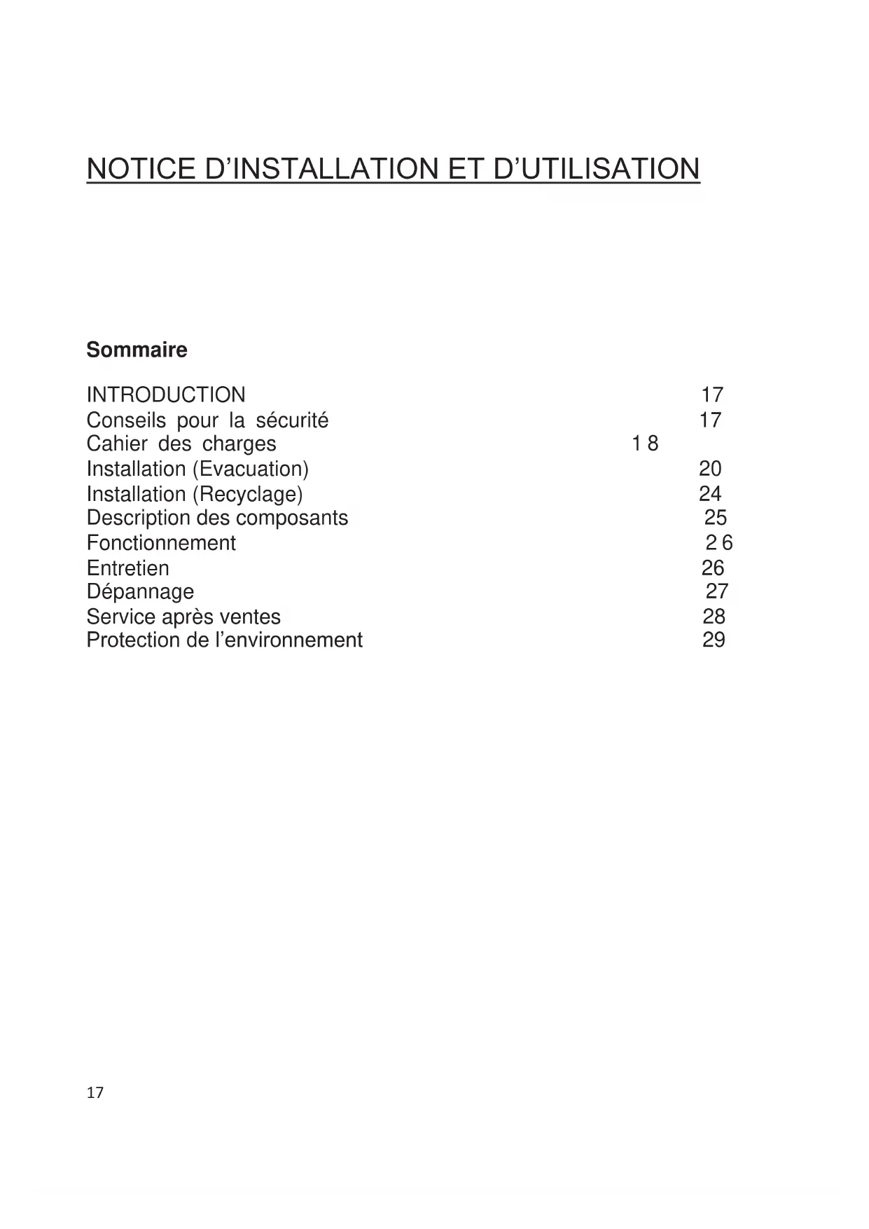 Cahier des charges 18 Installation (Evacuation) 20 Installation (Recyclage) 24 Description des composants 25 Fonctionnement 26 Entretien 26 Dépannage 27 Service après ventes 28 Protection de l’environnement 2918 Introduction Merci d‘avoir choisi cette hotte. Ce manuel d'instructions est conçu pour vous fournir toutes les instructions requises relatives à l'installation, l'utilisation et l'entretien de l'appareil. Afin de faire fonctionner l'appareil correctement et en toute sécurité, merci de lire attentivement ce manuel avant l'installation et l'utilisation. La hotte utilise des matériaux de haute qualité avec un design épuré. Equipé d’un moteur électrique de grande puissance et d’un ventilateur centrifuge, il fournit également une puissance d'aspiration forte, un fonctionnement avec un bruit modéré, un filtre à graisse et un montage facile. En plaçant le marquage sur ce produit , nous déclarons, sous notre propre responsabilité, le respect à tous de la sécurité européenne, la santé et les exigences environnementales énoncées dans la législation pour ce produit. Avertissement de sécurité x Ne pas laisser d’enfants utiliser l’appareil x Cette hotte est dédiée à un usage domestique uniquement. Elle ne doit pas être utilisée pour les barbecues, les rôtisseries ou toutes autres activités x La hotte et ses filtres doivent être nettoyés régulièrement pour en garantir un bon état de fonctionnement x Respecter les consignes de ce manuel pour le nettoyage de la hotte afin d’empêcher tout risque d’incendie x Merci de garder une ventilation dans la cuisine x Avant de connecter cet appareil, contrôlez que le cordon d'alimentation n'est pas endommagé. Un cordon d'alimentation endommagé doit être remplacé par une personne qualifiée. x Il doit y avoir une ventilation adéquate de la pièce quand la hotte est utilisée en même temps que des appareils utilisant du gaz ou d'autres combustibles x l'air ne doit pas être évacué par un conduit qui est utilisé pour évacuer les fumées des appareils utilisant le gaz ou d'autres combustibles19 x La réglementation concernant le rejet de l’air doit être satisfaite x Cet appareil n’est pas destiné à être utilisé par des personnes (notamment les enfants) incapables, irresponsables ou sans connaissance sur l’utilisation du produit, à moins qu’elle ne soit surveillées ou instruites sur l’utilisation de l’appareil par une personne responsable de leur sécurité x Les enfants doivent être surveillés pour s'assurer qu'ils ne jouent pas avec l'appareil. x Ne pas faire flamber sous la hotte x La hotte n'est pas destinée à être installé au-dessus d’une plaque de cuisson ayant plus de quatre foyers de cuisson Risque de choc électrique x Cette hotte ne peut être branchée seulement sur une prise reliée à la terre. En cas de doute, demandez conseil à un ingénieur qualifié x Le non-respect de ces instructions peut entraîner la mort, un incendie ou un choc électrique.20 Liste d’accessoires pour l’installation Caractérisriques Visuels Qty Base