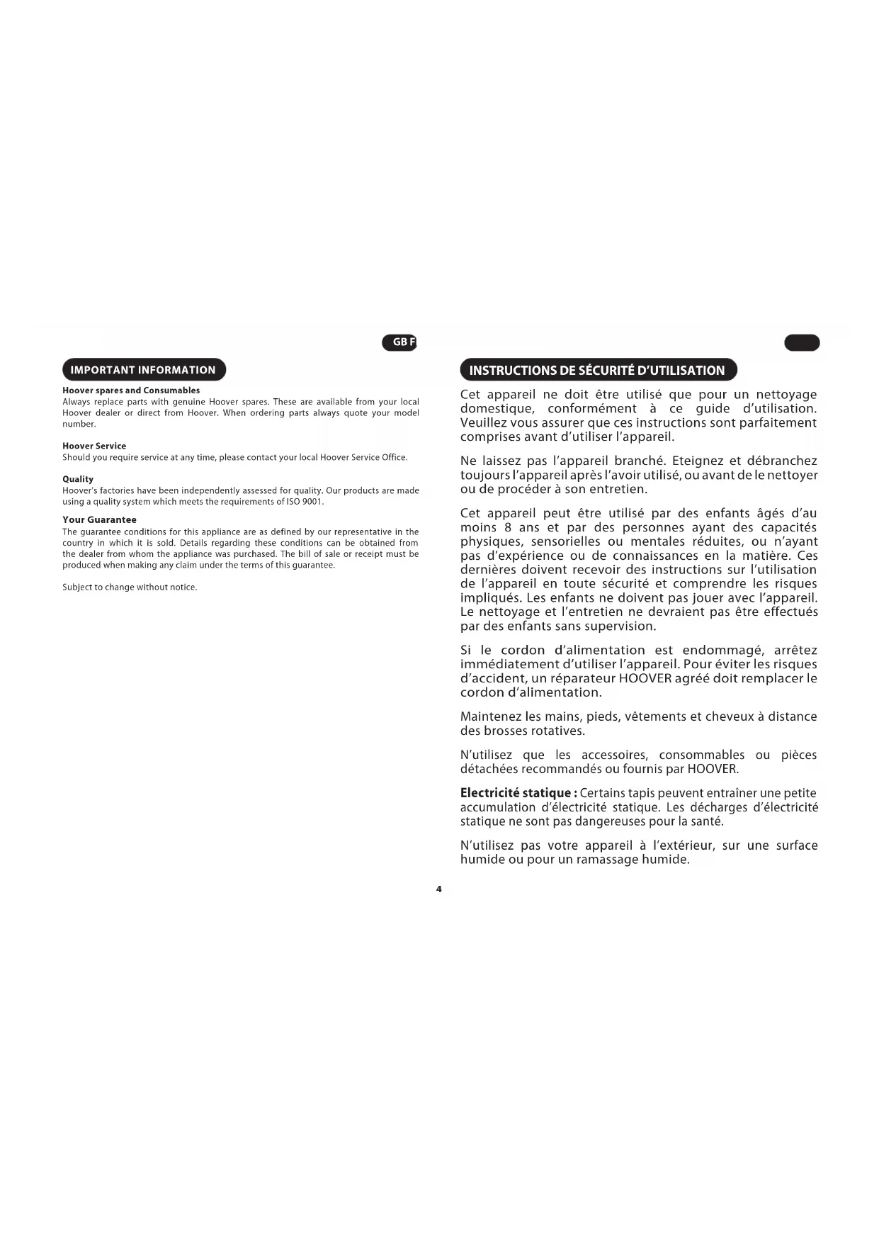 INFORMATIONS IMPORTANTES Pièces détachées et consommables Hoover Toujours remplacer les pièces par des pièces détachées de la marque Hoover. Celles-ci sont disponibles auprès de votre revendeur Hoover. Lors de la commande de pièces, veuillez toujours préciser le numéro de votre modèle. Service Hoover Pour toute intervention à tout moment, veuillez contacter le service après-vente Hoover le plus proche. Qualité La qualité des usines Hoover a fait l’objet d’une évaluation indépendante. Nos produits sont fabriqués selon un système de qualité conforme à la norme ISO 9001. Votre garantie Les conditions de garantie de cet appareil sont définies par notre représentant dans le pays où il est vendu et peuvent être obtenues auprès de votre revendeur. Les détails concernant ces conditions peuvent être obtenues auprès du revendeur auprès duquel l’appareil a été acheté. La facture d’achat ou le reçu doivent être présentés pour toutes réclamations relevant des conditions de cette garantie. Ces conditions peuvent être modifiées sans préavis.