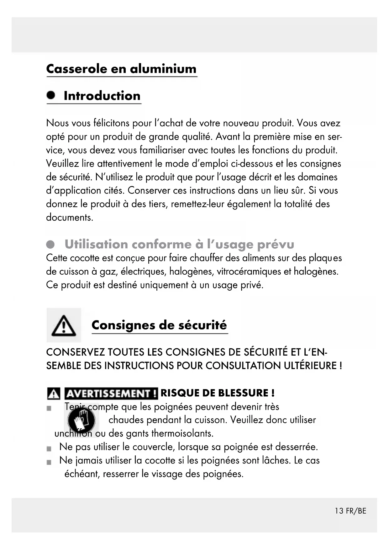 de cuisson à gaz, électriques, halogènes, vitrocéramiques et halogènes. Ce produit est destiné uniquement à un usage privé. Consignes de sécurité CONSERVEZ TOUTES LES CONSIGNES DE SÉCURITÉ ET L‘EN- SEMBLE DES INSTRUCTIONS POUR CONSULTATION ULTÉRIEURE ! RISQUE DE BLESSURE ! Tenir compte que les poignées peuvent devenir très chaudes pendant la cuisson. Veuillez donc utiliser unchiffon ou des gants thermoisolants. Ne pas utiliser le couvercle, lorsque sa poignée est desserrée. Ne jamais utiliser la cocotte si les poignées sont lâches. Le cas échéant, resserrer le vissage des poignées.14 FR/BE RISQUE DE DÉGÂTS MATÉRIELS ! Il est important, lors de la cuisson, de ne pas quitter des yeux les casseroles et poêles dans lesquelles on fait chauffer des graisses. La graisse peut chauffer et s’enflammer rapidement. Si la graisse s’enflamme, ne jamais tenter de l’éteindre avec de l’eau ! Étouffez les flammes avec un couvercle ou une couverture en laine épaisse. Afin de ne pas endommager le revêtement antiadhésif, utiliser uni- quement des ustensiles de cuisine en plastique résistant à la cha- leur ou en bois. Ne pas couper les aliments cuits directement dans la casserole. Ne mettez pas de viande ruisselante dans de la graisse chaude. Les projections de graisse sur la plaque de cuisinière chaude peuvent aisément causer un incendie. Faites des économies d’énergie! Choisissez une zone de cuisson équivalente au diamètre de contact de la casserole pour éviter des pertes de chaleur. Diamètre du fond efficace : env. 12 cm. Le produit peut s‘utiliser sans couvercle afin de conserver au chaud des mets dans un four (max. 160 °C pendant 1 heure). Des températures élevées peuvent entraîner une décoloration de l‘extérieur du produit. Cette caractéristique n‘est pas un défaut du matériau et ne nuit pas à la qualité ou à la fonctionnalité du produit. Ne tenez jamais l‘appareil chaud sous de l‘eau courante froide. Le dessous du produit pourrait être endommagé, ou bien se déta- cher de sa surface. Le produit peut se nettoyer au lave-vaisselle. Le nettoyage fréquent avec des nettoyants agressifs peut entraîner un endommagement et / ou une décoloration de la cocotte. Le nettoyage dans le lave-vaisselle peut décolorer les pièces en aluminium.15 FR/BE ATTENTION ! Le couvercle en verre peut se briser / est non résis- tant aux chocs ! Lors du lavage à la main, nettoyez la cocotte à l’eau très chaude avec un produit vaisselle courant. Proscrire l’utilisation de tout ob- jet coupant et pointu afin de ne pas endommager le matériel. Ne pas traîner ou pousser le produit sur une plaque vitrocéramique ou halogène. Si vous ne respectez pas ces instructions, vous ris- quez de rayer vos plaques.