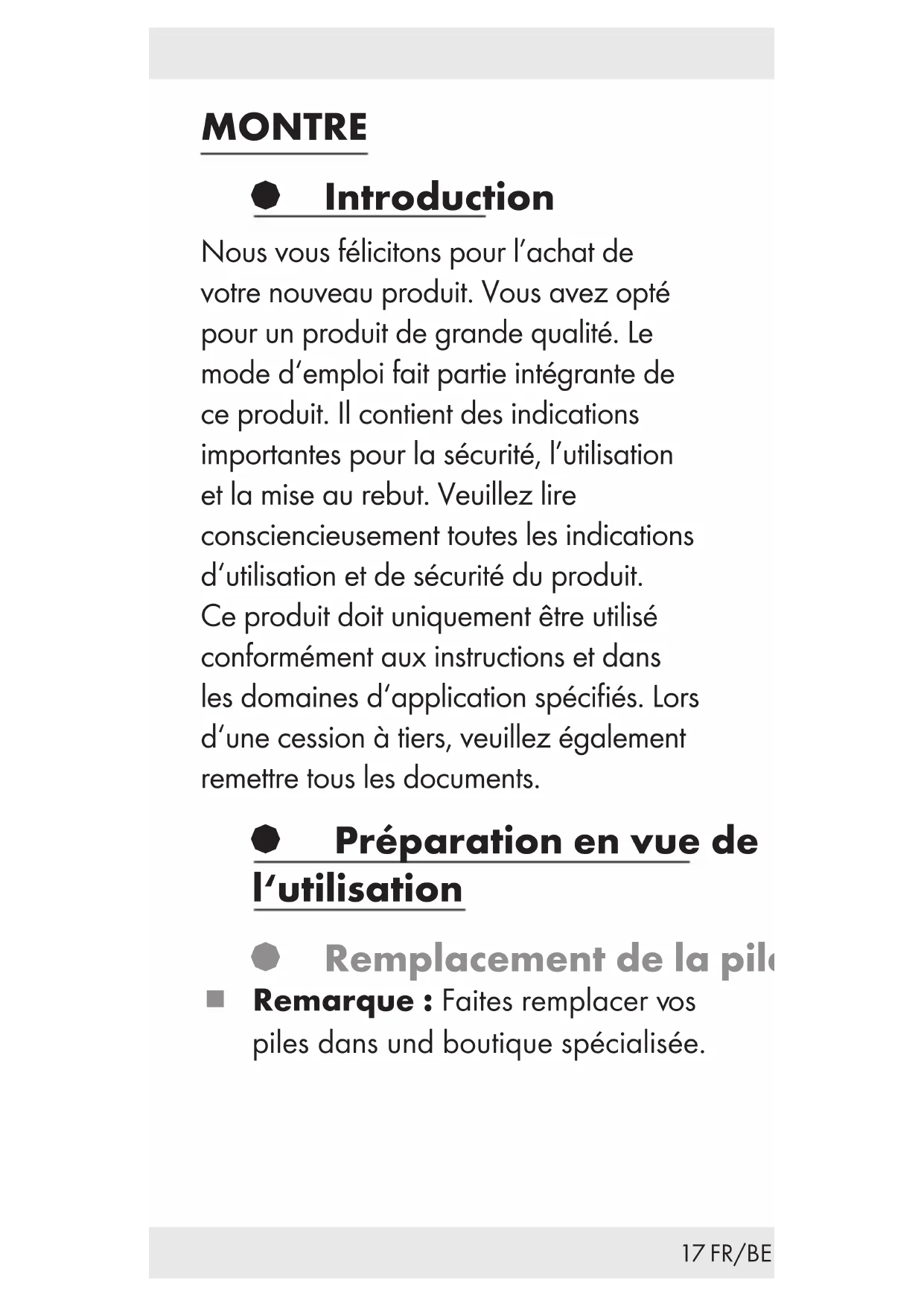 dans le sens contraire des aiguilles d‘une montre pour marquer le début d‘une mesure de temps.20 FR/BE § Nettoyage et entretien Nettoyez uniquement l’extérieur du produit, à l’aide d’un chiffon doux sec. § Recyclage L’emballage se compose de matières recyclables qui peuvent être mises au rebut dans les déchetteries locales. Les possibilités de recyclage des produits usés sont à demander auprès de votre municipalité. Pour le respect de l‘environnement, lorsque vous n‘utilisez plus votre produit, ne le jetez pas avec les ordures ménagères, mais entreprenez un recyclage adapté. Pour obtenir des renseignements et des horaires d‘ouverture concernant les points de collecte, vous pouvez contacter votre administration locale.21 FR/BE Les piles défectueuses ou usées doivent être recyclées conformément à la directive 2006 / 66 / EC and its amendments. Les piles et/ou l‘appareil doivent être retournés dans les centres de collecte. Pollution de l’environnement par mise au rebut incorrecte des piles ! Les piles ne doivent pas être mises au rebut dans les ordures ménagères. Elles peuvent contenir des métaux lourds toxiques et doivent être considérés comme des déchets spéciaux. Les symboles chimiques des métaux lourds sont les suivants : Cd = cadmium, Hg = mercure, Pb = plomb. Pour cette raison, veuillez toujours déposer les piles usées dans les conteneurs de recyclage communaux.22 FR/BE § GARANTIE L’appareil a été fabriqué selon des critères de qualité stricts et contrôlé consciencieusement avant sa livraison. En cas de défaillance, vous êtes en droit de retourner ce produit au vendeur. La présente garantie ne constitue pas une restriction de vos droits légaux. Cet appareil bénéficie d‘une garantie de 3 ans à compter de sa date d’achat. La durée de garantie débute à la date d’achat. Veuillez conserver le ticket de caisse original. Il fera office de preuve d’achat. Si un problème matériel ou de fabrication devait survenir dans 3 ans suivant la date d‘achat de ce produit, nous assurons à notre discrétion la réparation ou le remplacement de l‘appareil sans frais supplémentaires. La garantie prend fin si le produit est endommagé suite à une utilisation inappropriée ou à un entretien défaillant.23 FR/BE La garantie couvre les vices matériels et de fabrication. Cette garantie ne s’étend pas aux pièces du produit soumises à une usure normale (p. ex. des batteries) et qui, par conséquent, peuvent être considérées comme des pièces d’usure, ni aux dommages sur des composants fragiles, comme des interrupteurs, des batteries et des éléments fabriqués en verre. La garantie ne couvre pas non plus la perte de l’étanchéité à l’eau. L’état d’étanchéité à l’eau n’est pas une propriété durable et fait l’objet d’une maintenance périodique. Veuillez noter que votre garantie devient caduque pour les cas suivants: ouverture et la réparation de votre montre par des personnes non autorisées.24 NL/BE HORLOGE § Inleiding Hartelijk gefeliciteerd met de aankoop van uw nieuwe product. U heeft voor een hoogwaardig product gekozen. De gebruiksaanwijzing is een deel van het product. Deze bevat belangrijke aanwijzingen voor veiligheid, gebruik en verwijdering. Maakt U zich voor de ingebruikname van het product met alle bedienings- en veiligheidsvoorschriften vertrouwd. Gebruik het apparaat alleen zoals beschreven en voor de aangegeven toepassingsgebieden. Overhandig alle documenten bij doorgifte van het product aan derden. § Ingebruikneming § De batterij vervangen Opmerking: Laat de batterijen vervangen in een speciaalzaak.25 NL/BE § Display