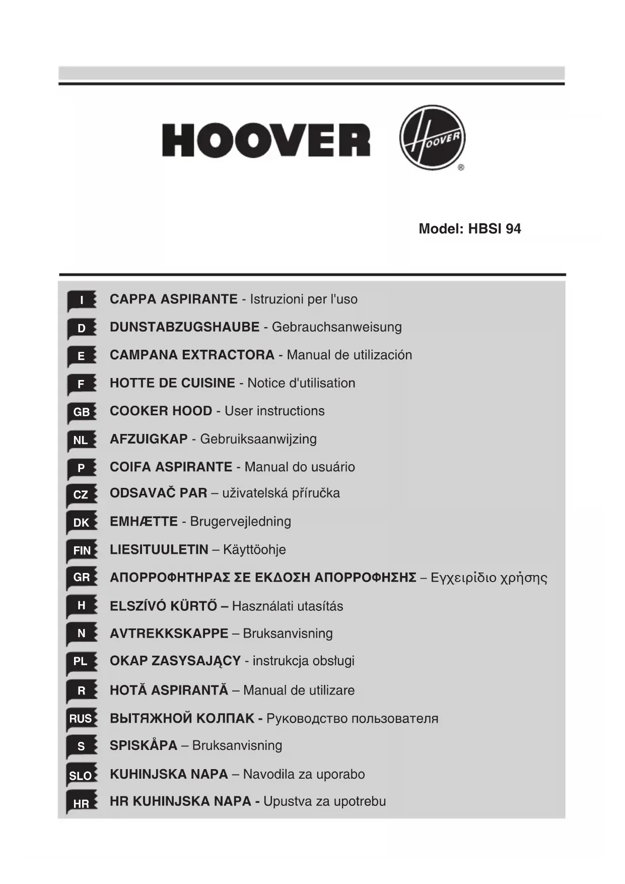 HBSI 94 X - Hotte HOOVER - Notice d'utilisation et mode d'emploi gratuit