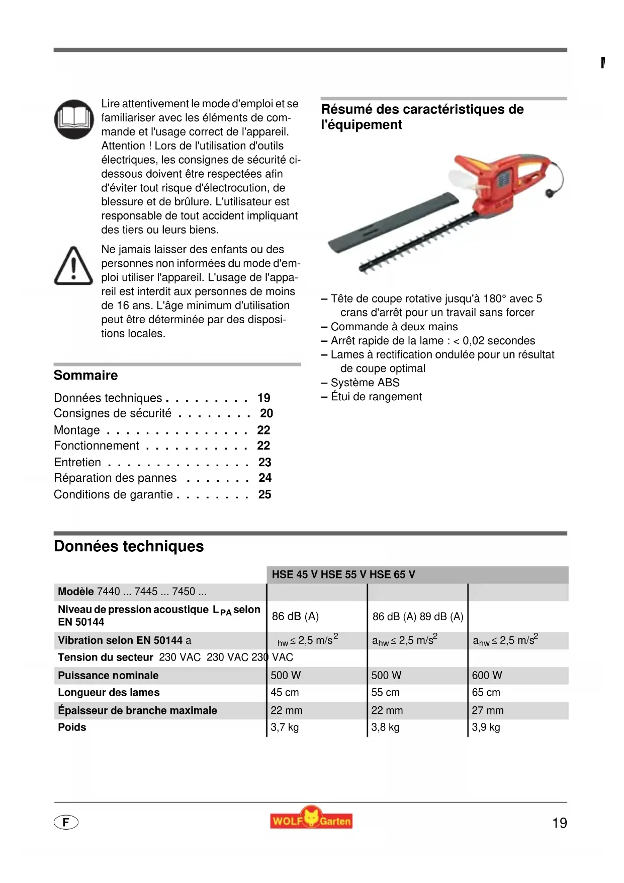 - Résumé des caractéristiques de l'équipement – Tête de coupe rotative jusqu'à 180° avec 5 crans d'arrêt pour un travail sans forcer – Commande à deux mains – Arrêt rapide de la lame : < 0,02 secondes – Lames à rectification ondulée pour un résultat de coupe optimal – Système ABS – Étui de rangement Données techniques Lire attentivement le mode d'emploi et se familiariser avec les éléments de com- mande et l'usage correct de l'appareil. Attention ! Lors de l'utilisation d'outils électriques, les consignes de sécurité ci- dessous doivent être respectées afin d'éviter tout risque d'électrocution, de blessure et de brûlure. L'utilisateur est responsable de tout accident impliquant des tiers ou leurs biens. Ne jamais laisser des enfants ou des personnes non informées du mode d'em- ploi utiliser l'appareil. L'usage de l'appa- reil est interdit aux personnes de moins de 16 ans. L'âge minimum d'utilisation peut être déterminée par des disposi- tions locales. HSE 45 V HSE 55 V HSE 65 VModèle 7440 Niveau de pression acoustique L selon EN 50144 86 dB (A) 86 dB (A) 89 dB (A)Vibration selon EN 50144 a p. 7445