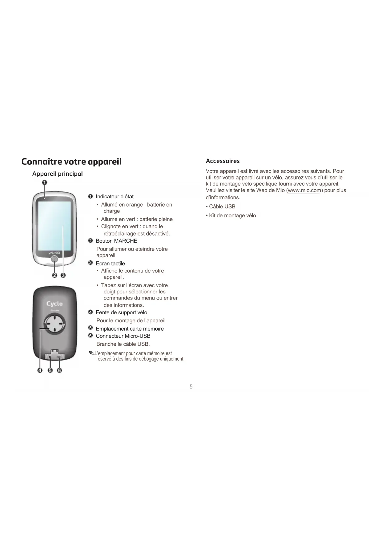 L’emplacement pour carte mémoire est réservé à des fins de débogage uniquement. Accessoires Votre appareil est livré avec les accessoires suivants. Pour utiliser votre appareil sur un vélo, assurez vous d’utiliser le kit de montage vélo spécifique fourni avec votre appareil. Veuillez visiter le site Web de Mio (www.mio.com) pour plus d’informations.