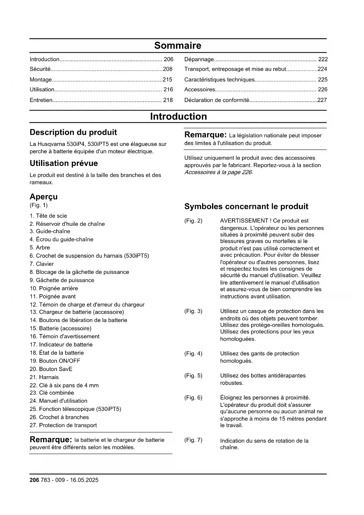 - Déclaration de conformité Introduction Description du produit La Husqvarna 530iP4, 530iPT5 est une élagueuse sur perche à batterie équipée d'un moteur électrique. Utilisation prévue Le produit est destiné à la taille des branches et des rameaux. Remarque: La législation nationale peut imposer des limites à l'utilisation du produit. Utilisez uniquement le produit avec des accessoires approuvés par le fabricant. Reportez-vous à la section Accessoires à la page 226 p. 227