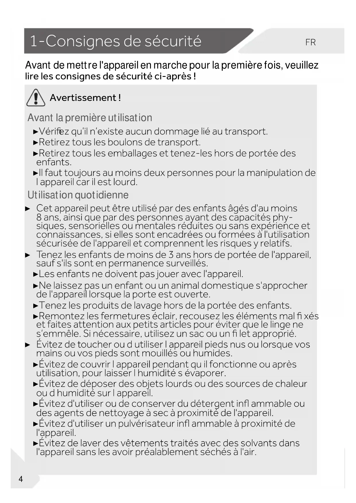 e l'appar eil en marche pour la première fois, veuillez lire les consignes de sécurité ci-après! Avertissement! Avant la première utilisation ▶ Véri ez qu’il n’existe aucun dommage lié au transport. ▶ Retirez tous les boulons de transport. ▶ Retirez tous les emballages et tenez-les hors de portée des enfants. ▶ Il faut toujours au moins deux personnes pour la manipulation de l’appareil car il est lourd. Utilisation quotidienne ▶ Cet appareil peut être utilisé par des enfants âgés d'au moins 8ans, ainsi que par des personnes ayant des capacités phy- siques, sensorielles ou mentales réduites ou sans expérience et connaissances, si elles sont encadrées ou formées à l'utilisation sécurisée de l'appareil et comprennent les risques y relatifs. ▶ Tenez les enfants de moins de 3ans hors de portée de l'appareil, sauf s'ils sont en permanence surveillés. ▶ Les enfants ne doivent pas jouer avec l'appareil. ▶ Ne laissez pas un enfant ou un animal domestique s'approcher de l'appareil lorsque la porte est ouverte. ▶ Tenez les produits de lavage hors de la portée des enfants. ▶ Remontez les fermetures éclair, recousez les éléments mal xés et faites attention aux petits articles pour éviter que le linge ne s’emmêle. Si nécessaire, utilisez un sac ou un let approprié. ▶ Évitez de toucher ou d’utiliser l’appareil pieds nus ou lorsque vos mains ou vos pieds sont mouillés ou humides. ▶ Évitez de couvrir l’appareil pendant qu’il fonctionne ou après utilisation, pour laisser l’humidité s’évaporer. ▶ Évitez de déposer des objets lourds ou des sources de chaleur ou d’humidité sur l’appareil. ▶ Évitez d'utiliser ou de conserver du détergent in ammable ou des agents de nettoyage à sec à proximité de l'appareil. ▶ Évitez d'utiliser un pulvérisateur in ammable à proximité de l'appareil. ▶ Évitez de laver des vêtements traités avec des solvants dans l'appareil sans les avoir préalablement séchés à l'air.FR 1-Consignes de sécurité