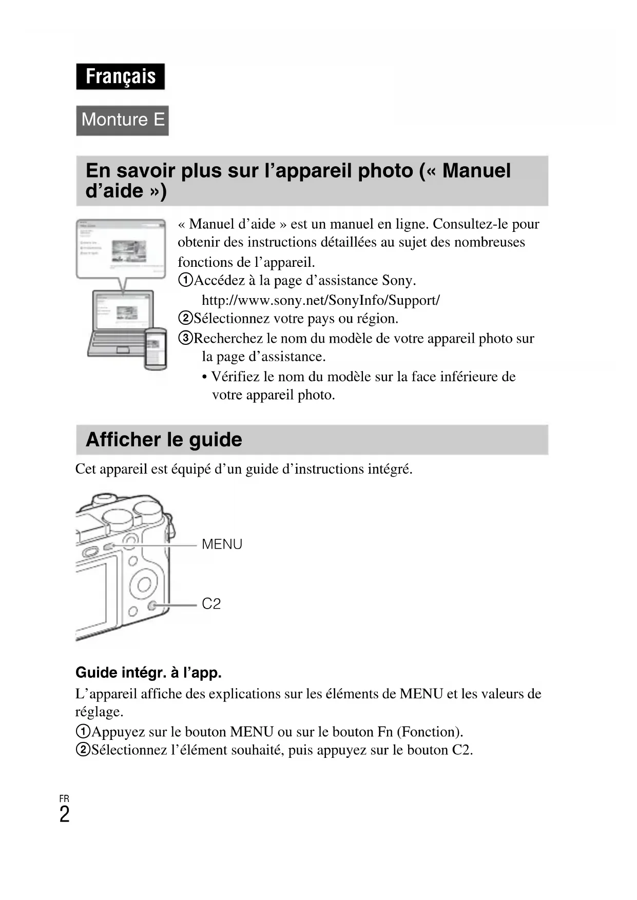 Cet appareil est équipé d’un guide d’instructions intégré. Guide intégr. à l’app. L’appareil affiche des explications sur les éléments de MENU et les valeurs de réglage. 1 Appuyez sur le bouton MENU ou sur le bouton Fn (Fonction). 2 Sélectionnez l’élément souhaité, puis appuyez sur le bouton C2. Français Monture E En savoir plus sur l’appareil photo (« Manuel d’aide ») « Manuel d’aide » est un manuel en ligne. Consultez-le pour obtenir des instructions détaillées au sujet des nombreuses fonctions de l’appareil. 1 Accédez à la page d’assistance Sony. http://www.sony.net/SonyInfo/Support/ 2 Sélectionnez votre pays ou région. 3 Recherchez le nom du modèle de votre appareil photo sur la page d’assistance.