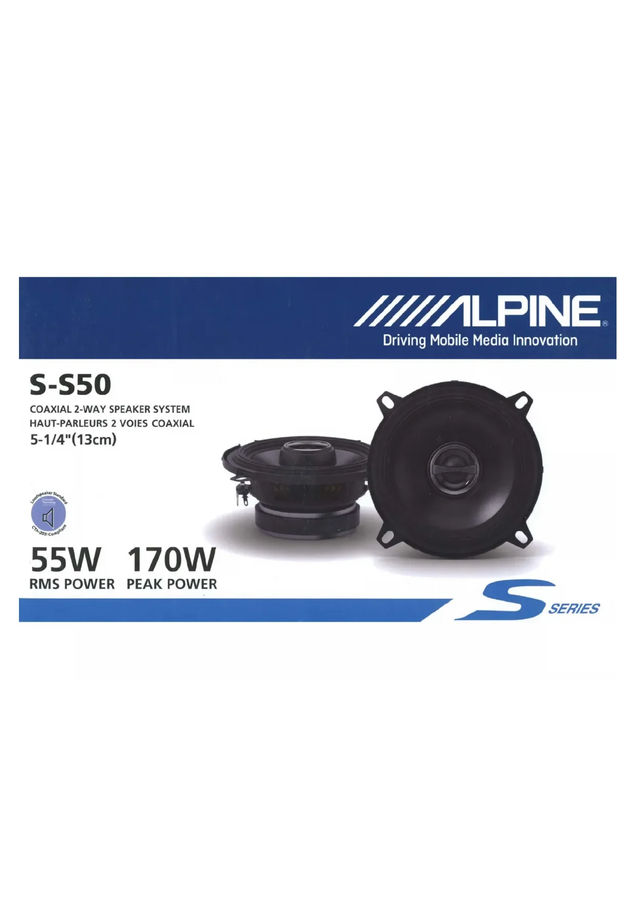 | Caractéristiques techniques | Haut-parleur ALPINE SS50, 5.25 pouces, puissance nominale 50W, impédance 4 Ohms, réponse en fréquence 70Hz - 22kHz. |